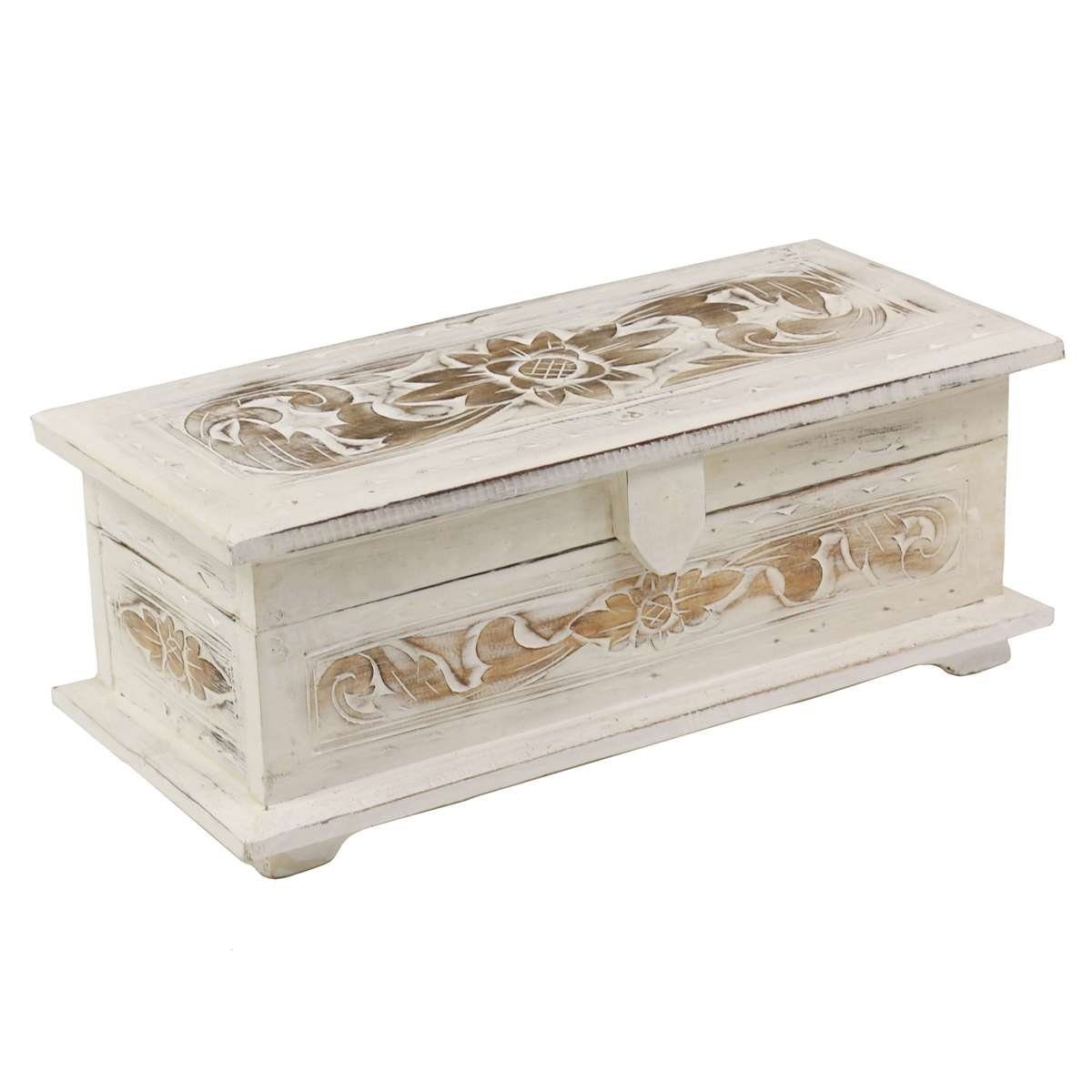 Der charmante Shabby-Stil, mit weißer teils abgetragener Farbe verleiht der Truhe einen einzigartigen Vintage-Look.