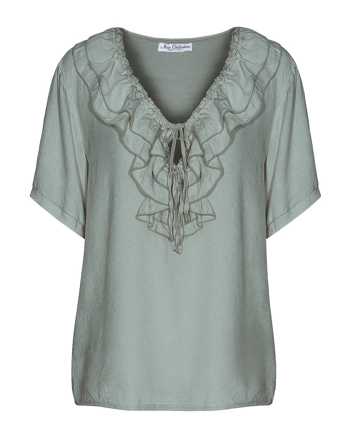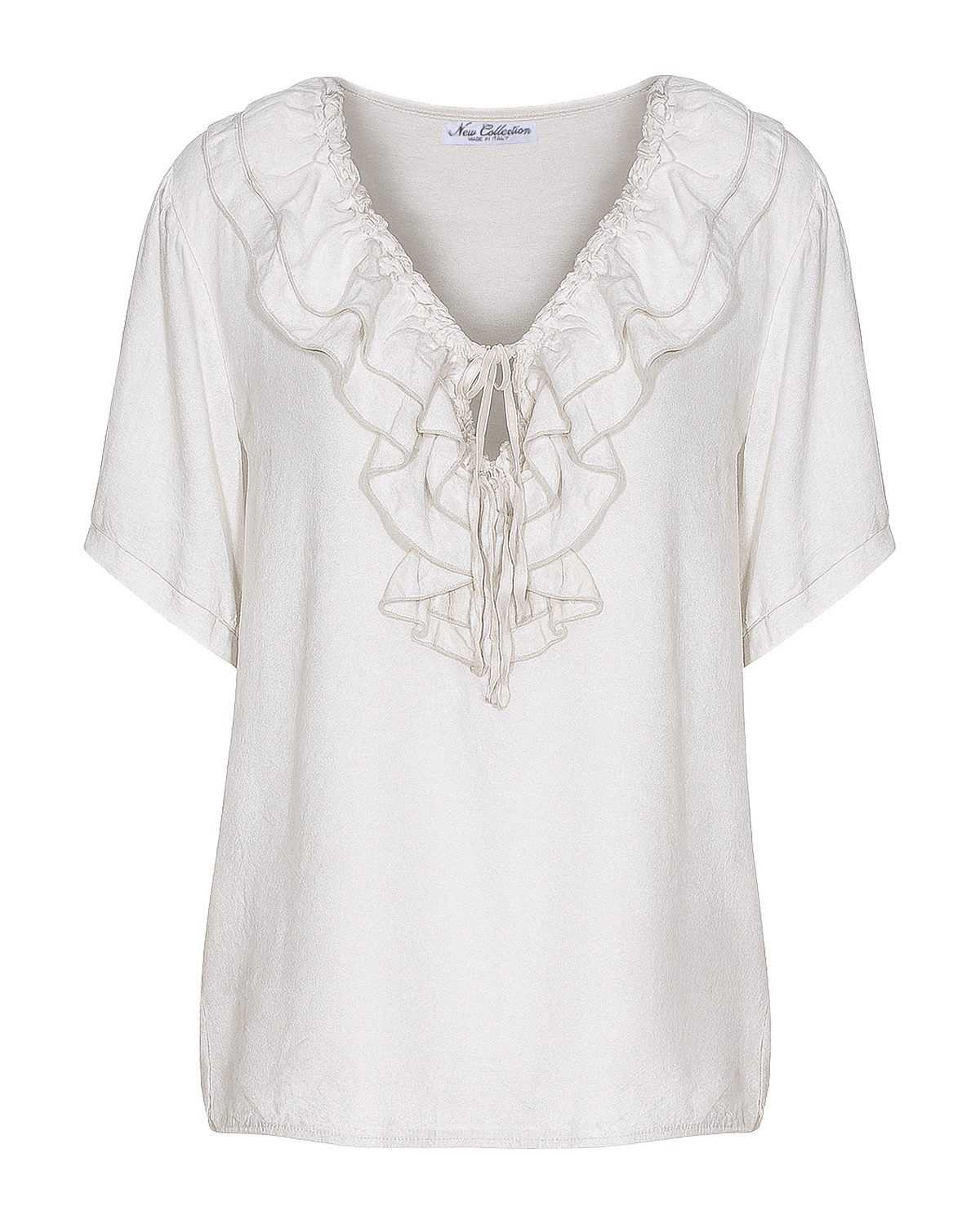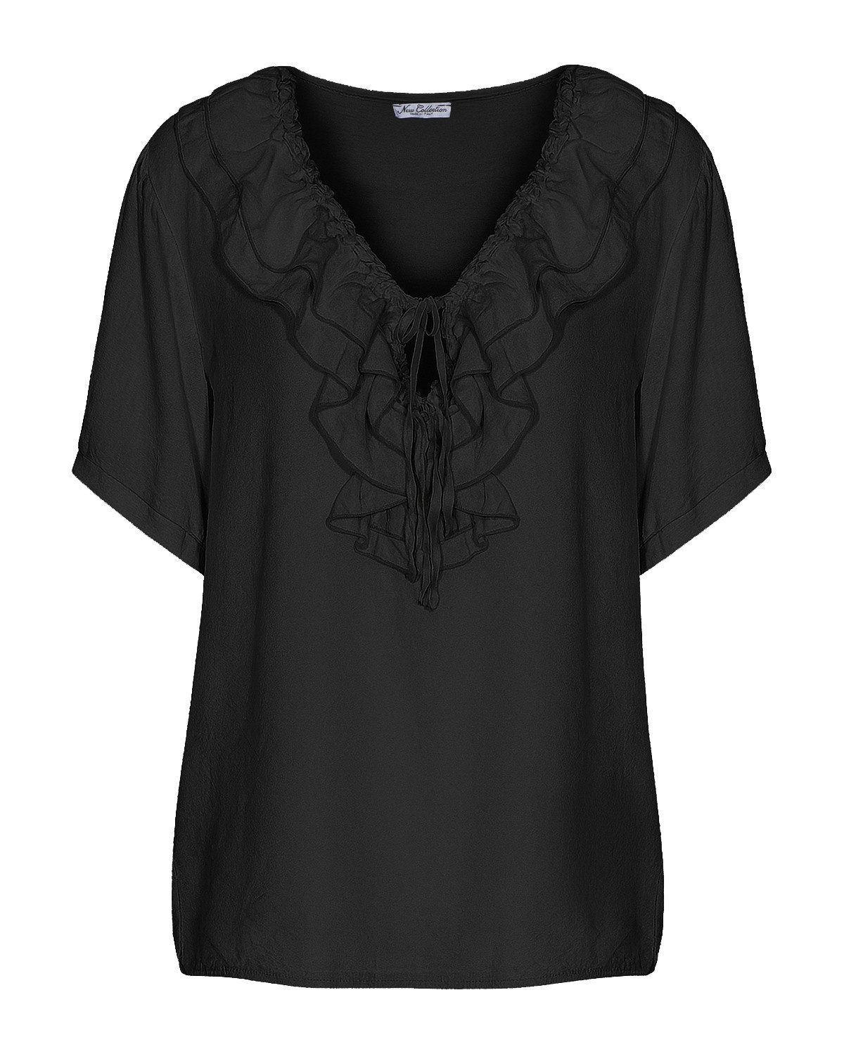 Spüre den Hauch angenehmer Sommerabende in unserer Kurzarm-Rüschenbluse: