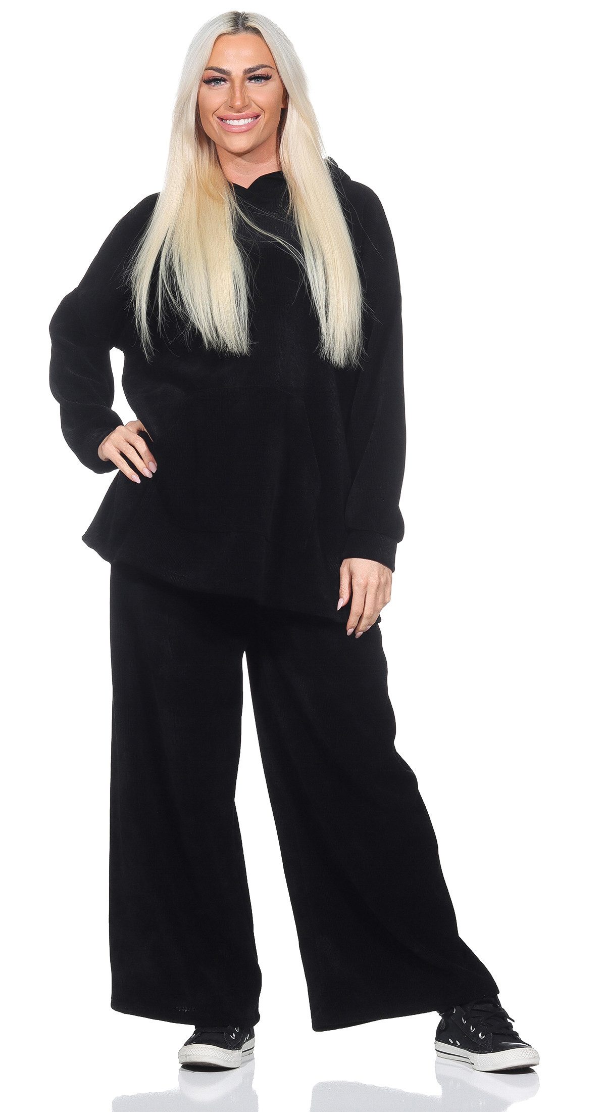 Die Kombination aus Cord-Hoodie und Culotte-Hose überzeugt durch einen lässigen