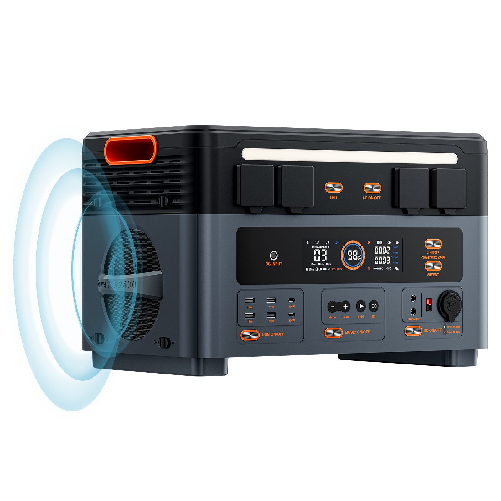 Der OSCAL PowerMax 2400 ist ein abnehmbarer Stromspeicher mit einer starken Leistung von 2400W. Leicht, einfach zu demontieren und zu transportieren, geräuscharm und kälteresistent. Mit zwei Lautsprechern - 24 W im Bass und 10 W in den Höhen.