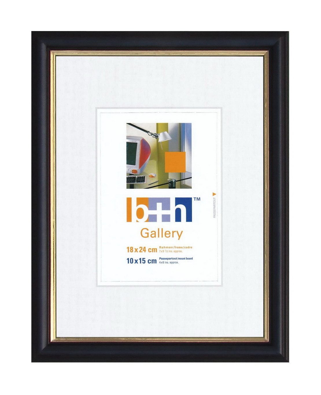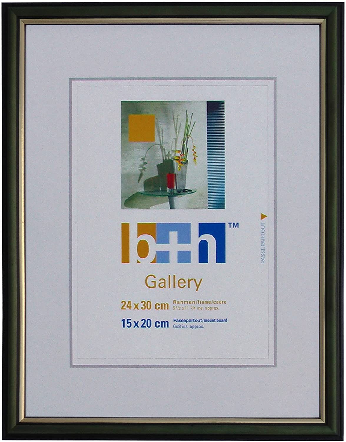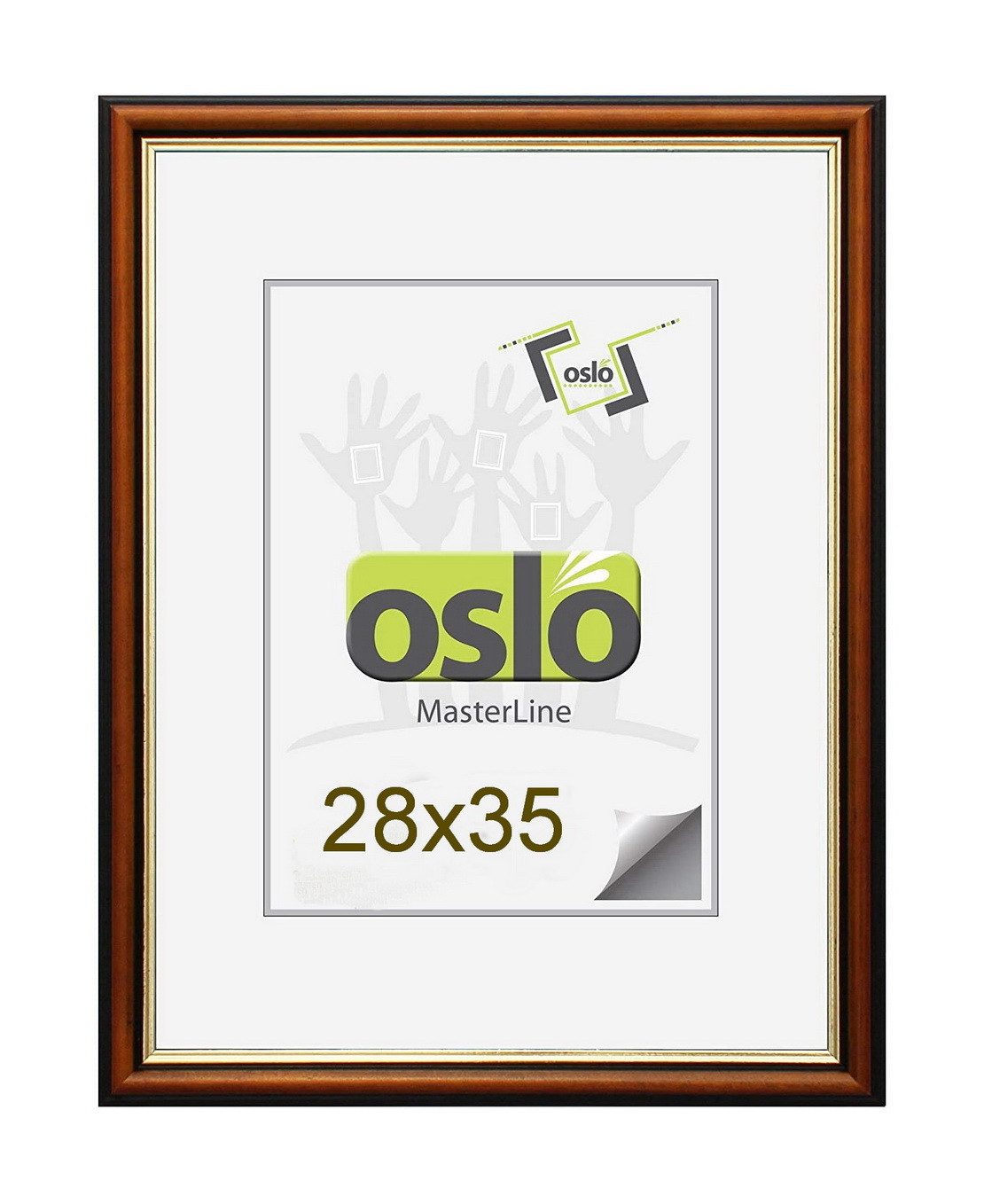 OSLO Masterline Bilderrahmen zeichnen sich durch ihre einwandfreie Stabilität, Funktion und Langlebigkeit aus. Perfekte Verarbeitung, stabile Aufhängung und Aufsteller mit praktischem Verschluss-System sind weitere Vorzüge. Ein moderner, schlichter Rahmen, der zu jedem Bild passt. Der Bilderrahmen ist aus hochwertigem Massivholz gefertigt. Das Produkt ist FSC-zertifiziert (Zertifizierung nachhaltiger Forstwirtschaft). Wir beziehen das Holz für unsere Produkte aus kontrolliertem Anbau in Neuseeland. Durch die aufwendige Fräsung des Profils und dem goldenen Innenrand erhält der Fotorahmen eine antike Ausstrahlung, ohne rustikal zu wirken. Der Innenrand ist mit Goldfolie überzogen, und glänzt entsprechend. Der Fotorahmen passt sich seiner Umgebung sehr gut an, und ist hervorragend für Portraitfotos geeignet. Durch die Drehspannfedern ist das Austauschen der Bilder sehr einfach. Sie benötigen kein zusätzliches Werkzeug. Außerdem garantiert die stabile Rückwandkonstruktion, dass Ihr Bild in den Rahmen bzw. gegen die Glasscheibe gespannt wird. Dadurch wird ein Verschieben oder Rutschen des Bildes im Rahmen unterbunden. Die zusätzlichen Aufhänger sind mit Zacken versehen, so dass Ihr Bild immer gerade hängen wird. Der Fotorahmen hat genug Spannkraft für ein zusätzliches Passepartout bis 2,5 mm Kartondicke. Oder bestellen Sie bei uns ein passendes Passepartout mit Ihrem benötigten Bildausschnitt. Wir verfügen über eine computergesteuerte Schneidemaschine und fertigen individuelle Passepartouts, auch mit mehreren Ausschnitten für viele Fotos und Bilder mit ovalen – rechteckigen oder quadratischen Ausschnitten. Das Bild liegt dann optisch tiefer und bekommt eine viel hochwertigere Ausstrahlung. Diesen Rahmen führen wir in den Farben - braun - schwarz - gold - blau - schwarz - gold - grün - schwarz – gold und in den Größen - 10 x 15 - 13 x 18 - 15 x 20 - 18 x 24 - 24 x 30 - 28 x 35 - 30 x 40 - 40 x 50