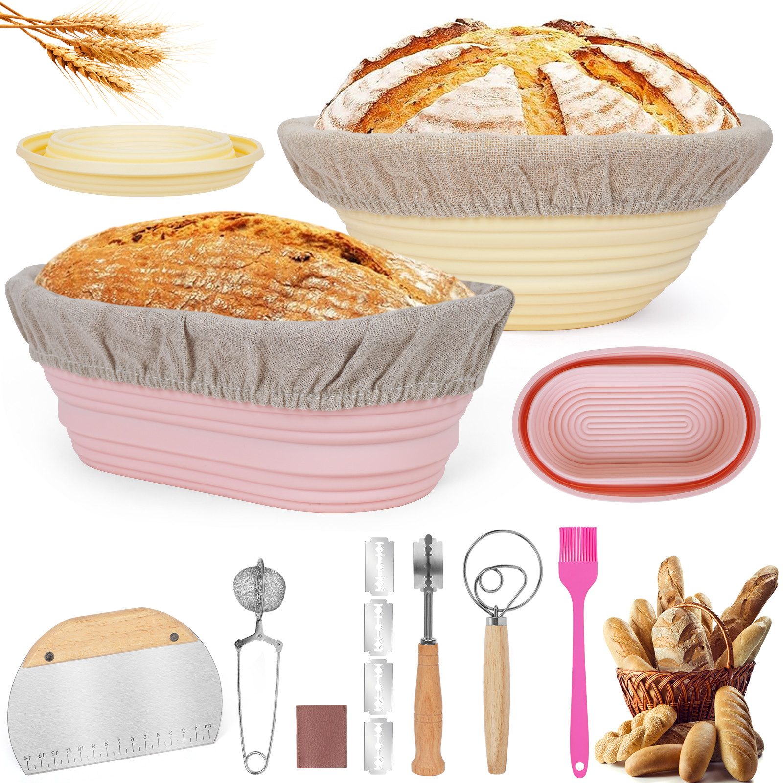 Komplettes BacksetUnser Gärkörbchen für Brot Set enthält 1 runden Brotkorb und ovalen Brotkorb, 2 Futter aus Baumwolle und Leinen, 1 Messer zum Konturieren von Brot (mit 5 extra Rasierklinge), 1 teigschaber edelstahl, 1 Dänischer Teigbesen und 1 Mehl- und Zuckersieb.