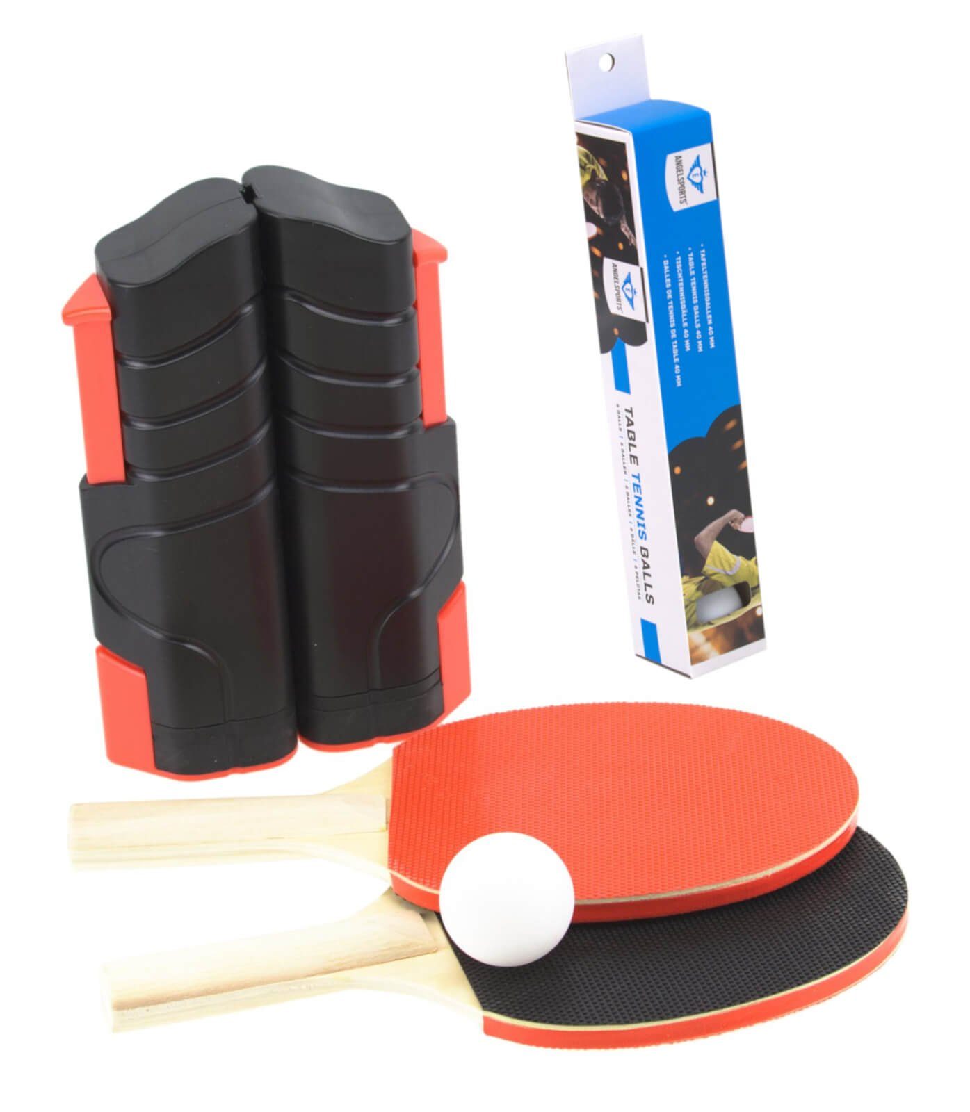Mit Schläger, Ball und Netz mit Schnellspanner und Aufrollfunktion.