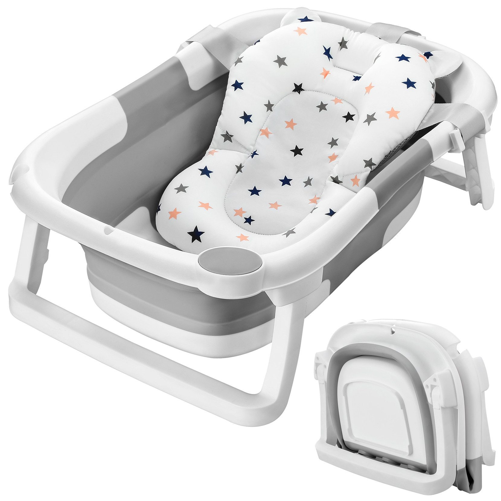 Die Badewanne hat ein weiches Kissen, das es Babys, die noch nicht sitzen können, ermöglicht, ein Bad im Liegen zu nehmen.