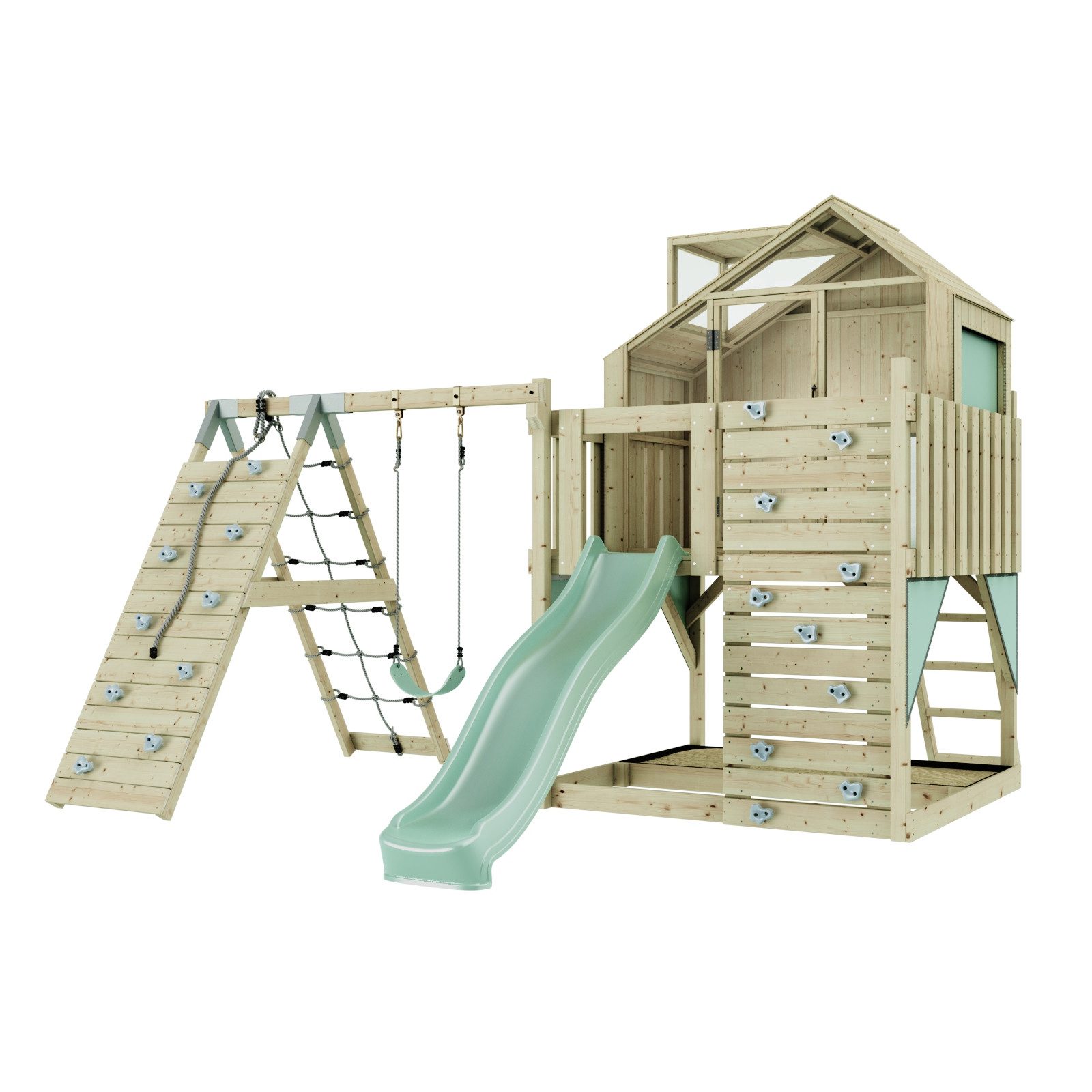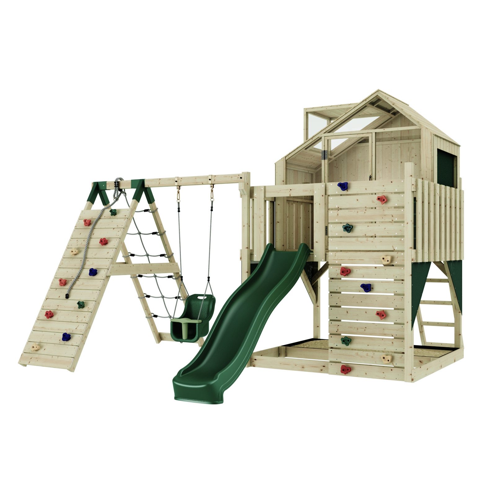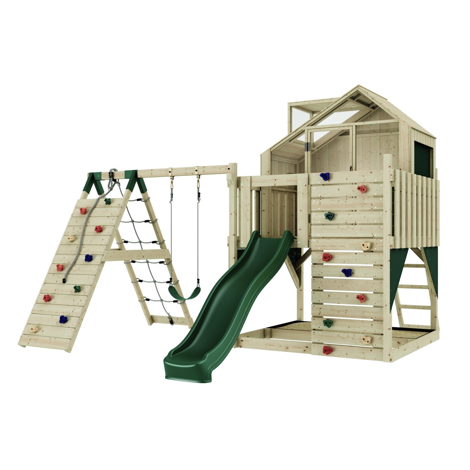 Описание товара (мы ещё работаем над переводом, извините за неудобство): Anika und ihr Bruder Tim haben zusammen mit ihrer besten Freundin die Welt erobert. Nun erobert unser gleichnamiges Spielgerät Ihren Garten und lässt deine Kinder viele spannende Abenteuer erleben. Dank der vielen Spielmöglichkeiten sind der Fantasie deiner Kinder keine Grenzen gesetzt und sie können sich gemeinsam auf dem Spielturm austoben. Der Bereich unter dem Spielturm kann als Sandkasten genutzt werden. , Über die Kletterwand geht es auf die Plattform, von der dein Kind den ganzen Garten überblicken kann. Ob mit einer normalen, Baby- oder Nestschaukel, auf der Schaukel fliegt dein Nachwuchs durch die Lüfte. , Stabile Konstruktion aus unbehandeltem Holz , Einstellbare Schaukelhöhe , 10 Jahre Garantie auf Holzelemente , Viel Lichteinfall im Spielhaus Produktdetails: Pulverbeschichtete &, verzinkte Schaukelaufhängungen Sand ist nicht im Lieferumfang enthalten Maximales Gewicht: 50 kg pro Benutzer Длина: 399 ,cm Höhe: 291 ,cm Breite: 414 ,cm Farbe: Smaragdgrün Im Lieferumfang enthalten: Spielhaus- und Plattformkonstruktion Fenster aus Acrylglas Leiter zur Plattform Bunte Klettersteine Kinderschaukel 220 cm Wellenrutsche Sicherheitshinweise: Ab 3 Jahren geeignet Nur für den Privat-/Hausgebrauch geeignet Benutzung nur unter Aufsicht eines Erwachsenen Montagehinweis: Eine vollständige Montageanleitung ist im Lieferumfang enthalten. Das Holz des Artikels ist nicht vorgebohrt. Für die Montage brauchst du Werkzeuge, unter anderem eine Bohrmaschine. Wir empfehlen, das Holz mit der OutdoorToys Holzlasur zu imprägnieren, um es gegen Witterung und Schädlinge zu schützen. ,Zur Befestigung des Produkts werden Bodenanker benötigt, diese sind im Zubehör zu finden. Benutzungshinweis: Dieses Produkt wird aus unbehandeltem Holz hergestellt und kann Risse aufweisen. Diese sind normal und haben keinen Einfluss auf die Struktur, Stärke, Stabilität oder Haltbarkeit des Produkts. , , Die Outdoor Toys Holzlasur schützt unbehandeltes Holz auf nachhaltige Weise vor Witterung und Schädlingen und machen es so länger haltbar. Unsere Lasur ist nach Norm EN 71-3 getestet und somit ideal für Kinderspielgeräte geeignet. Bitte beachte, dass die Imprägnierung vor dem Aufbau des Kinderspielgeräts erfolgen muss, um den maximalen Schutz zu erreichen. Die OutdoorToys Holzlasur kann als Zubehör erworben werden. , Dieser Artikel wurde gemäß der Spielzeugsicherheitsverordnung DIN EN 71 konzipiert und hergestellt. Die abgebildeten Farben und angegebenen Maße können minimal abweichen.