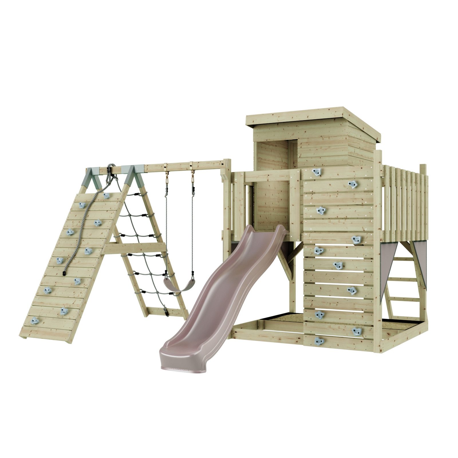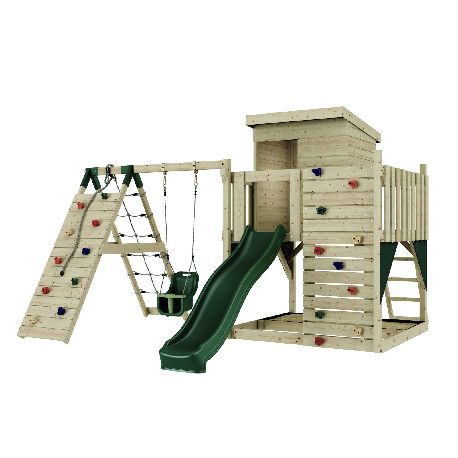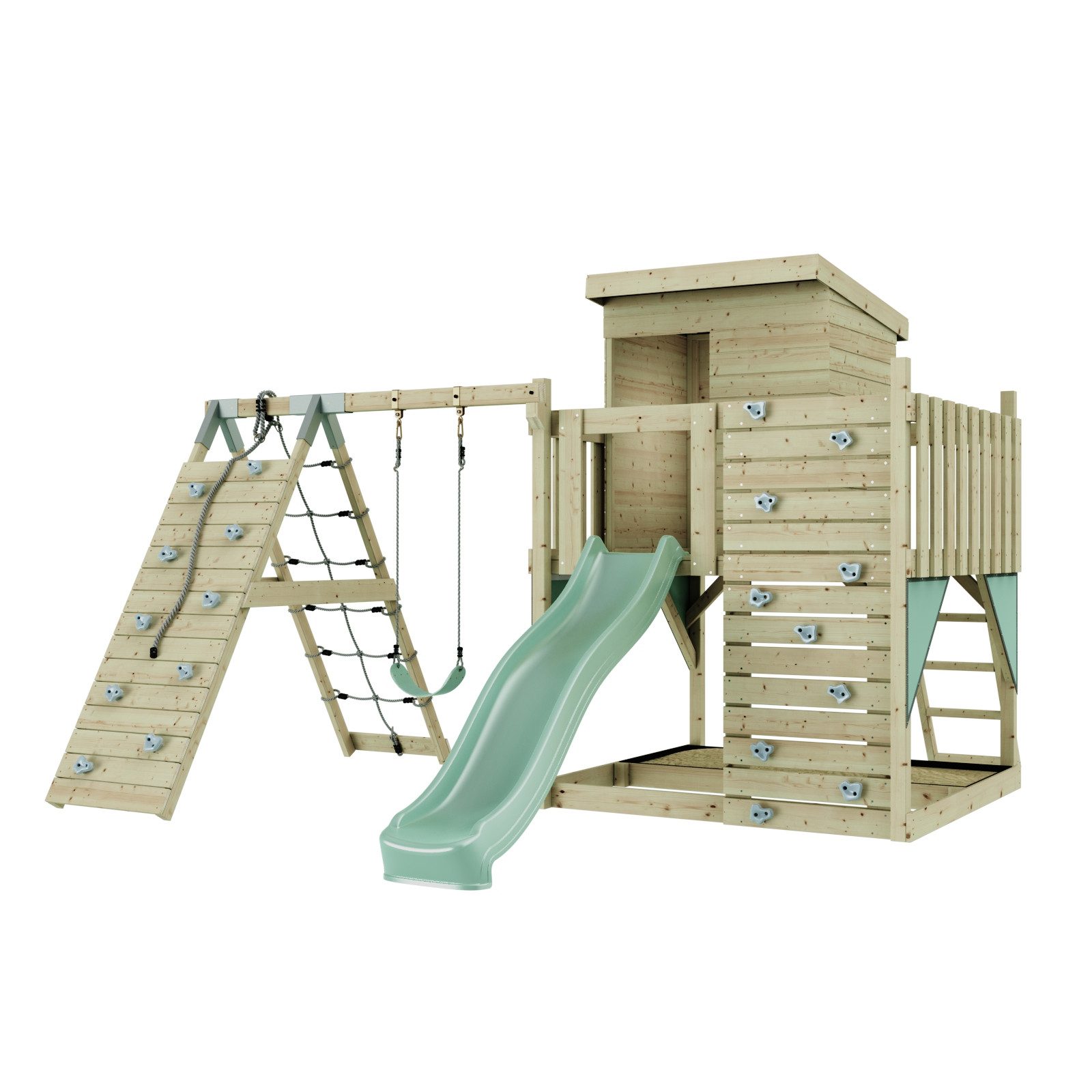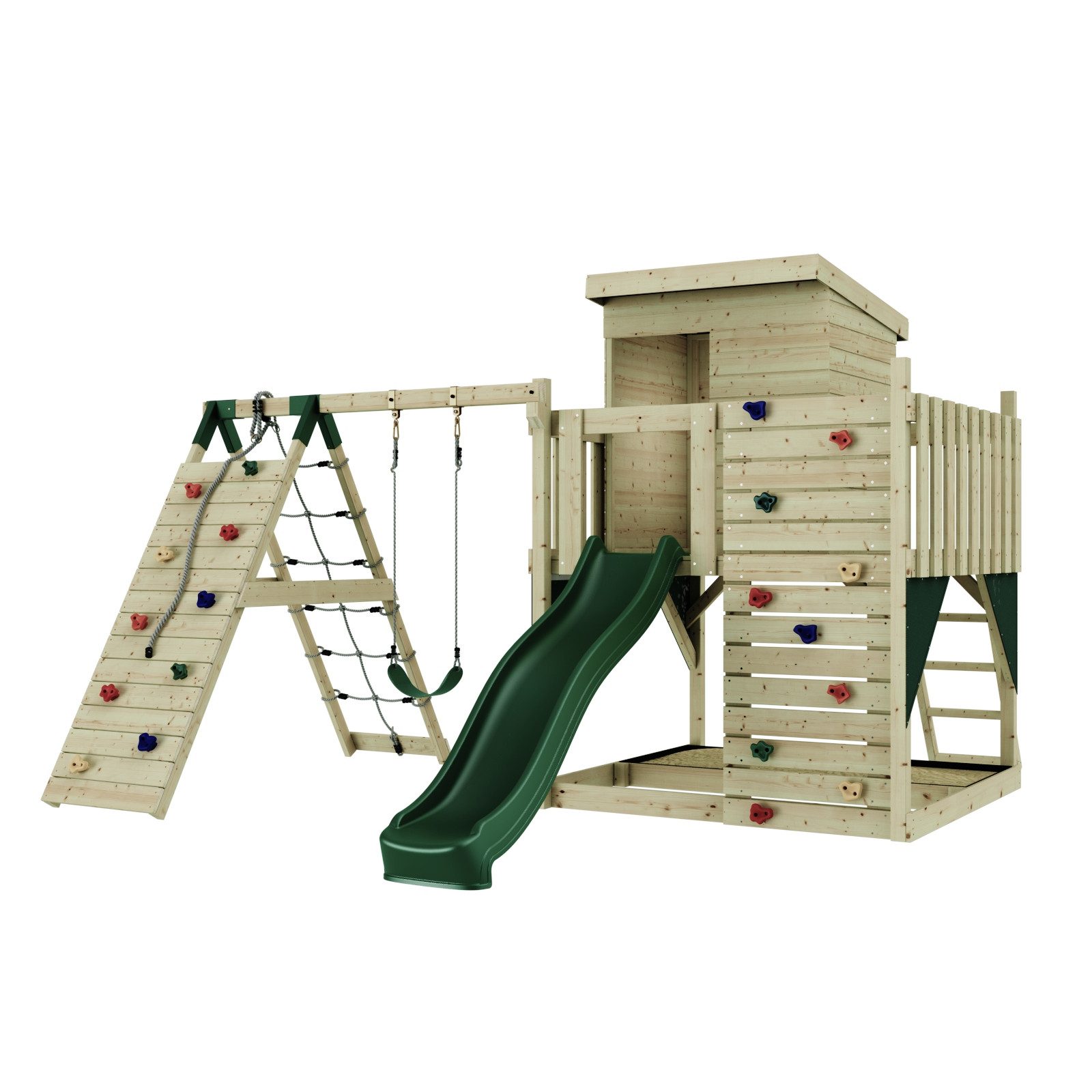 Erforsche das lebendige Spieluniversum des OutdoorToys Spielturms Freja! Dieser vielseitige Spielturm verspricht nicht nur Spaß, sondern auch eine Prise nordischer Magie. Schaukel dich dabei in den Himmel und bezwinge mit deinen Freunden die Kletterwand wie ein echter Abenteurer. Der Bereich unter dem Spielturm kann als Sandkasten genutzt werden. , Stabile Konstruktion aus unbehandeltem Holz Modernes Spielhaus Spritzgegossene Wellenrutsche Aufstiegsleiter auf die Plattform Höhenverstellbare Schaukelseile Pulverbeschichtete &, verzinkte Schaukelaufhängungen , Produktdetails des OutdoorToys Spielturms: Einzelschaukel 50 kg Maximalgewicht Длина: 396 cm Höhe: 260 ,cm Breite: 414 ,cm 120 cm Plattformhöhe 220 cm Rutschenlänge Farbe: Eisblau Ausführung: Kinderschaukel Sicherheitshinweise: Nicht für Kinder unter 3 Jahren geeignet Nur für den Haus-/Privatgebrauch geeignet Benutzung nur unter unmittelbarer Aufsicht von Erwachsenen Montagehinweise: Das Holz ist nicht vorgebohrt, eine vollständige Anleitung liegt bei der Lieferung bei. Für die Befestigung des Artikels sind Bodenanker notwendig. Diese kannst du hinzufügen, nachdem das Produkt in den Warenkorb gelegt wurde. Alternativ findest du unsere Bodenankersets unter Upgrades &, Zubehör. Benutzungshinweis: Dieses Produkt wurde in Übereinstimmung mit der Spielzeugsicherheitsverordnung DIN EN 71 entworfen und hergestellt. Все angegebenen Maße und gezeigten Farben können geringfügig abweichen.