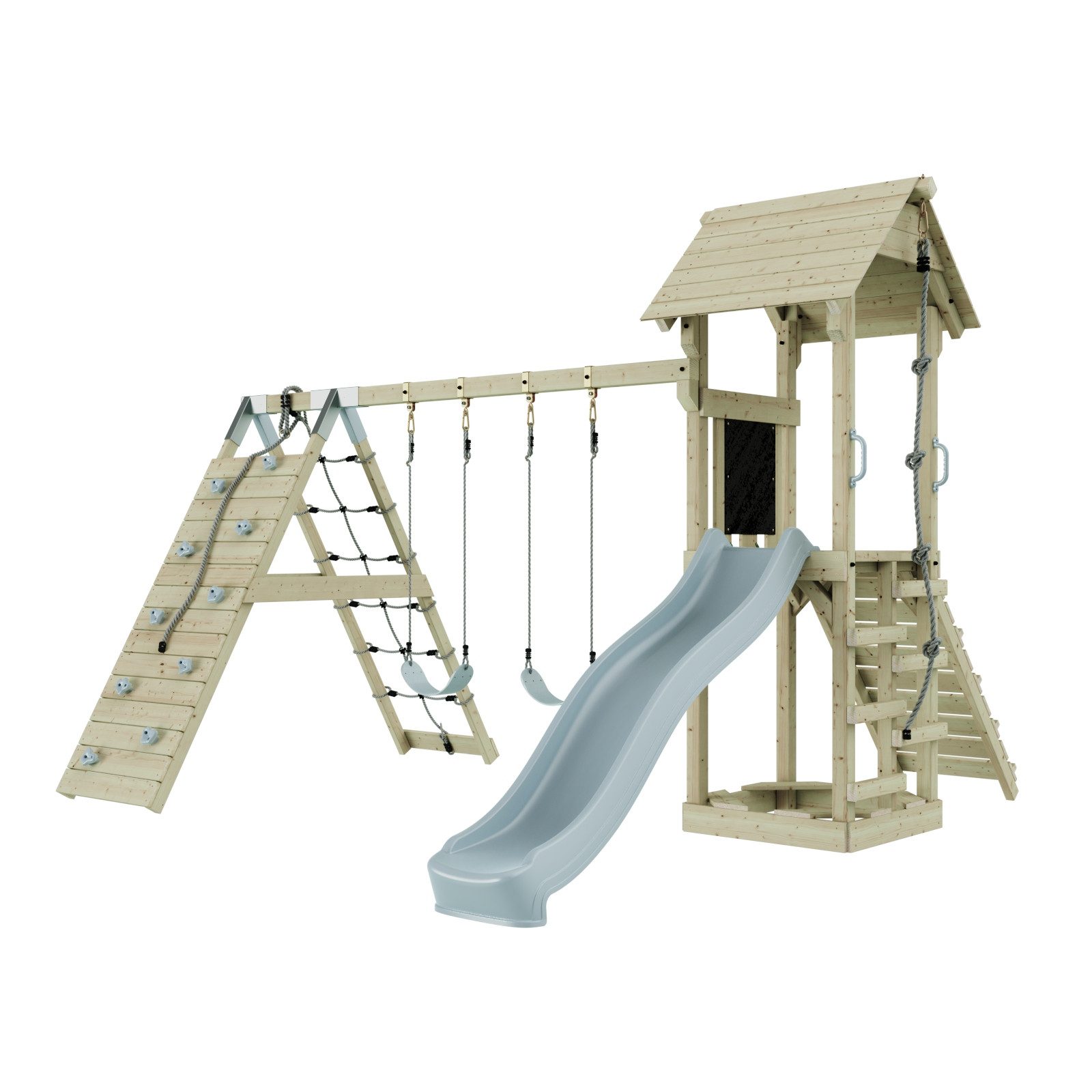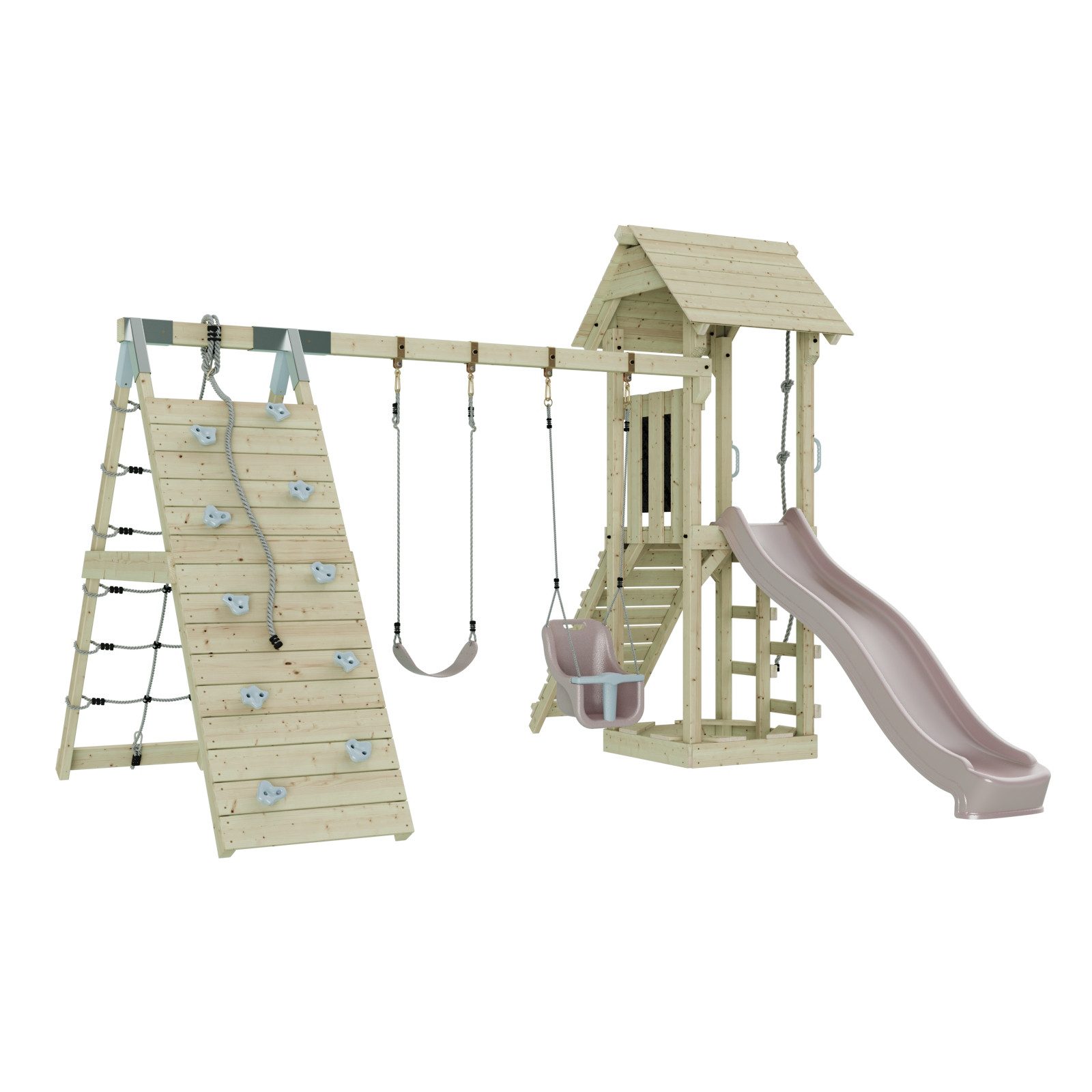 Der OutdoorToys Spielturm Kiruna lädt ein, die unendlichen Weiten deiner Fantasie zu erforschen! Gib deinem kleinen Abenteurer freien Lauf, bezwinge die Kletterwand und schwing dich wild auf der Doppelschaukel. Mit einer Fülle an Möglichkeiten ist der Spielturm Kiruna ein vielseitiges Wunder und der ideale Ort, um sich im Freien auszutoben. Benannt nach der nördlichsten Stadt der Welt - Kiruna! , Stabile Konstruktion aus unbehandeltem Holz Aufstiegsleiter auf die Plattform Kletterwand mit robusten Klettersteinen Höhenverstellbare Schaukelseile , Produktdetails des Spielturms Kiruna: Pulverbeschichtete & verzinkte Schaukelaufhängungen 50 kg Maximalgewicht für die Schaukel Plattformhöhe: 120 cm Rutschenlänge: 220 cm Schaukel: Kinderschaukel Farbe: Altrosa Lieferumfang des Spielturms: Spielturm inkl. Klettwerwand, Rutsche und Schaukeln Montagematerial und Aufbauanleitung , Montagehinweise: Das Holz ist nicht vorgebohrt, eine vollständige Anleitung liegt bei der Lieferung bei. Für die Befestigung des Artikels sind Bodenanker notwendig. Diese kannst du hinzufügen, nachdem das Produkt in den Warenkorb gelegt wurde. Alternativ findest du unsere Bodenankersets unter Upgrades &, Zubehör. Benutzungshinweis: Dieses Produkt wurde in Übereinstimmung mit der Spielzeugsicherheitsverordnung DIN EN 71 entworfen und hergestellt. Все angegebenen Maße und gezeigten Farben können geringfügig abweichen. Sicherheitshinweise: Nicht für Kinder unter 3 Jahren geeignet Nur für den Haus-/Privatgebrauch geeignet Benutzung nur unter unmittelbarer Aufsicht von Erwachsenen