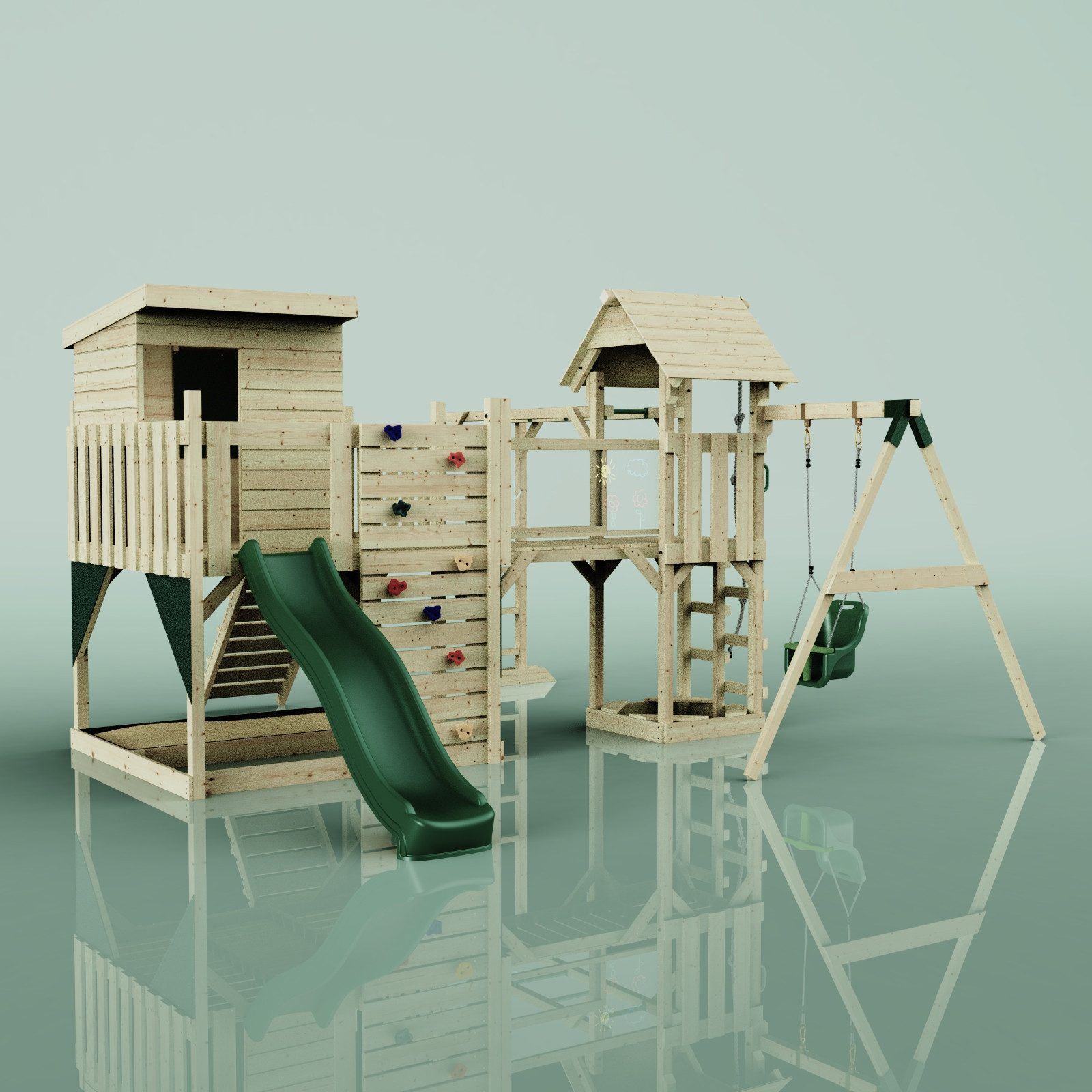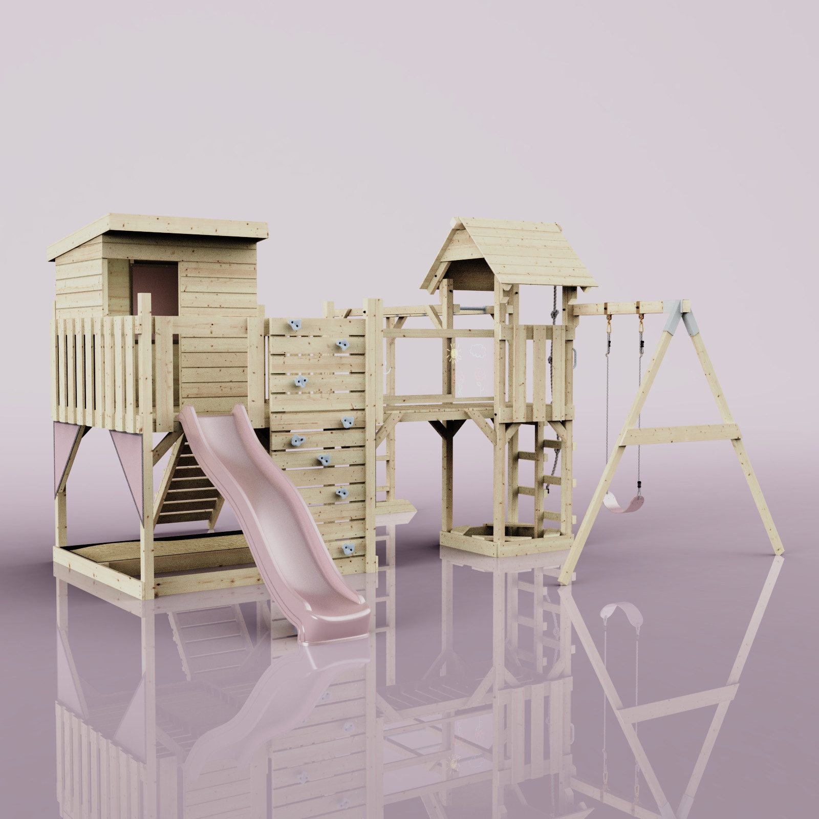Entdecken Sie den Kinderspielturm „Lene“ – der Name „Lene“ bedeutet „die Strahlende“ und dieser Holzspielplatz bringt genau das in deinen Garten. Mit Spielhäusern, Kletterwand, Rutsche und einer Brücke sorgt „Lene“ für aufregende Abenteuer. Besonders hervorzuheben ist die Einzelschaukel, die stundenlangen Spaß und Entspannung bietet.