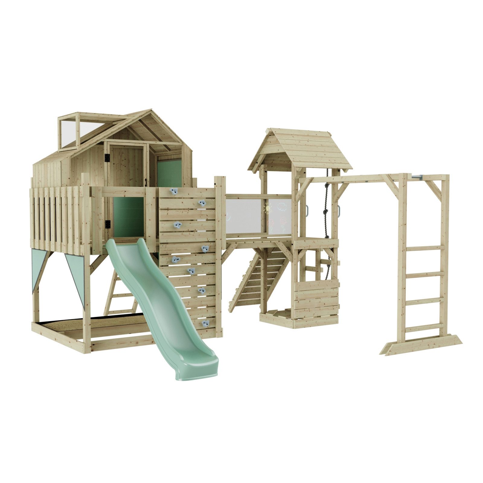 Tauche ein in die magische Welt des OutdoorToys Spielturms "Luna"! Dieses zauberhafte Spielparadies in Dunkelgrün verbindet nicht nur zwei Türme mit einer Brücke, sondern setzt auch ein gemütliches Spielhaus obendrauf. Inspiriert vom namen "Luna", was im lateinischen Mond bedeutet, taucht dieser Spielturm deine kleinen Abenteurer in eine galaktische Fantasiewelt.