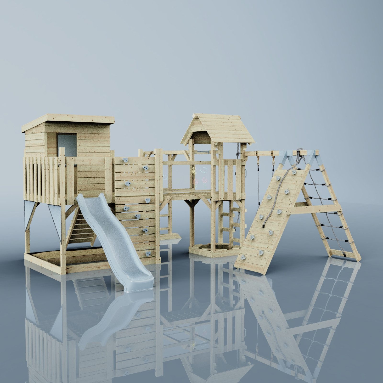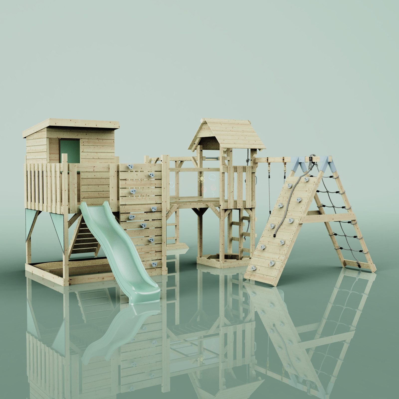 Entdecken Sie den Kinderspielturm „Tessa“. Dieser Holzspielplatz bringt eine reiche Ernte an Freude. Ausgestattet mit Spielhäusern, einer Kletterwand, einer Brücke und besonders einer aufregenden Rutsche, bietet „Tessa“ jede Menge Spielspaß.