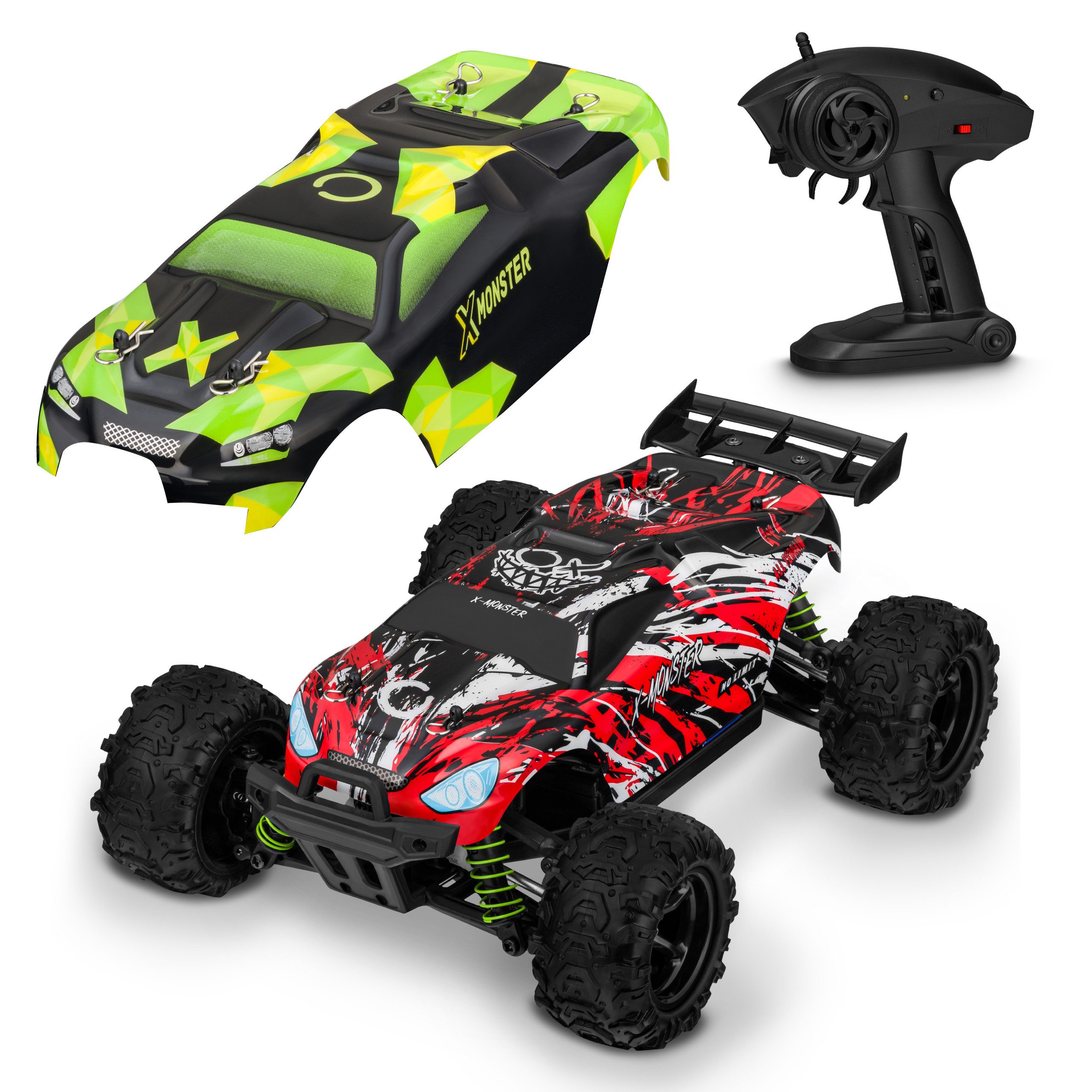 Ausstattung | Zwei Bodykits (Sport Rot + Extra Schwarz-Grun), RC Auto, Controller, 2x Akku |