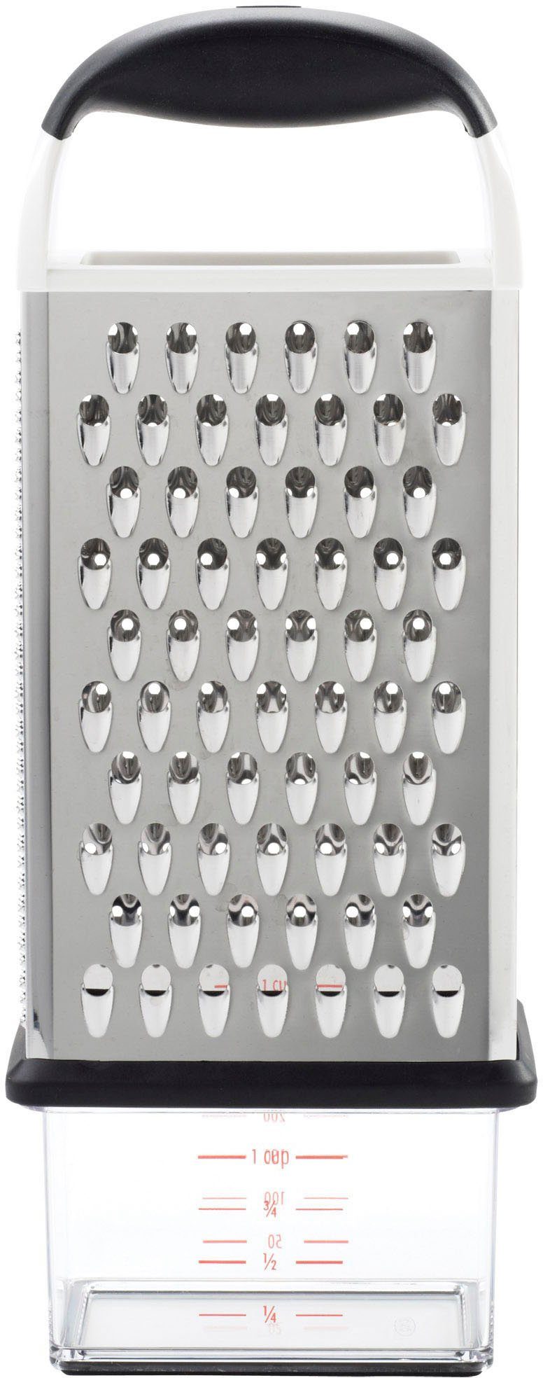VIELSEITIG: Die OXO Good Grips® Kastenreibe aus widerstandsfähigem Edelstahl ist mit vier unterschiedlichen Reibeflächen für Reiben, Raspeln und Hobeln ausgestattet.