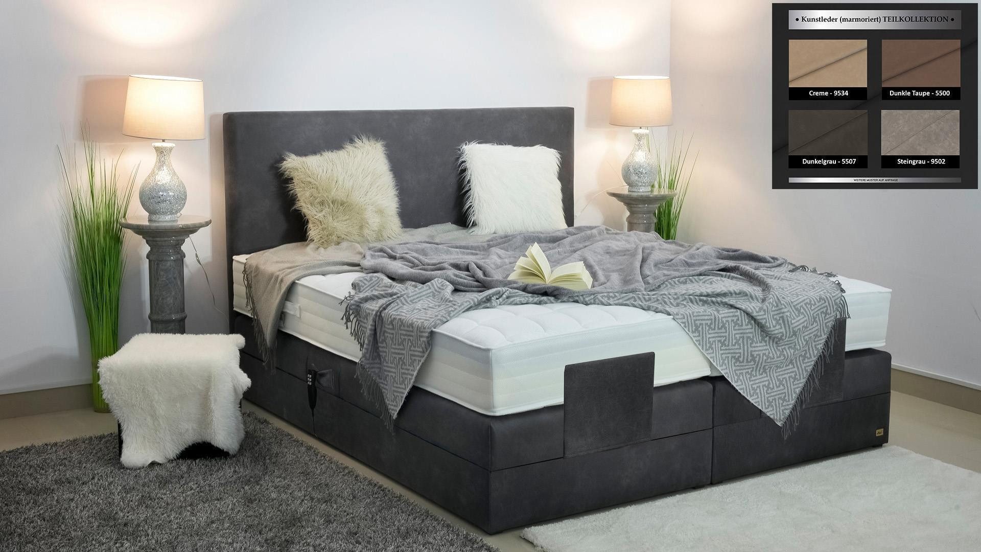 Lieferumfang | Boxspringbett mit Motor (10.000 Newton Leistung je Motor), Kopf- und Fußteilverstellung, 1x Royal-WS® 500 Taschenfederkern-Matratze mit integriertem Gelschaum-Topperkern, freie Farbwahl nach unseren Farbpaletten von Kunstleder marmoriert, Lieferung bis Wunschort mit Aufbau in 2-Mann Besatzung |