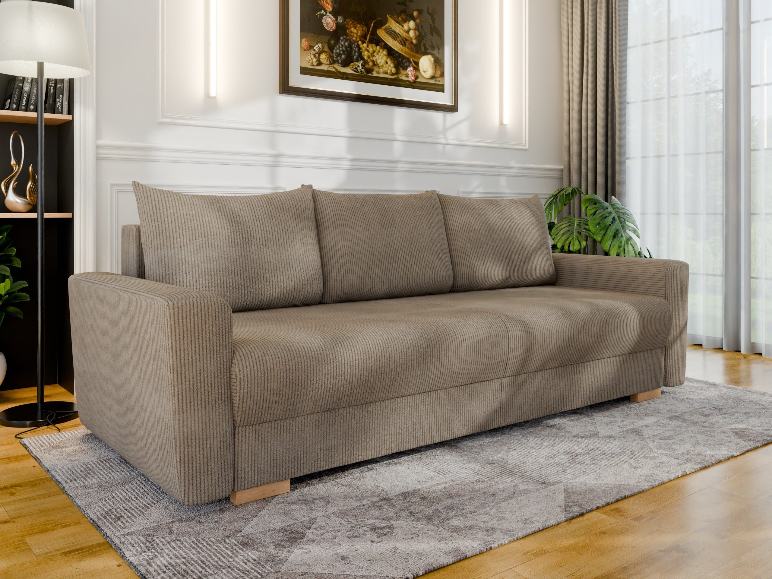 Das Schlafsofa „Elma” vereint modernes Design, hohen Komfort und clevere Funktionen – ideal für stilbewusste Wohnräume, Gästezimmer oder kleine Apartments. Mit seinem naturfarbenen Bezug in elegantem Beige fügt sich dieses Sofa harmonisch in jede Einrichtung ein und sorgt für ein warmes, wohnliches Ambiente.