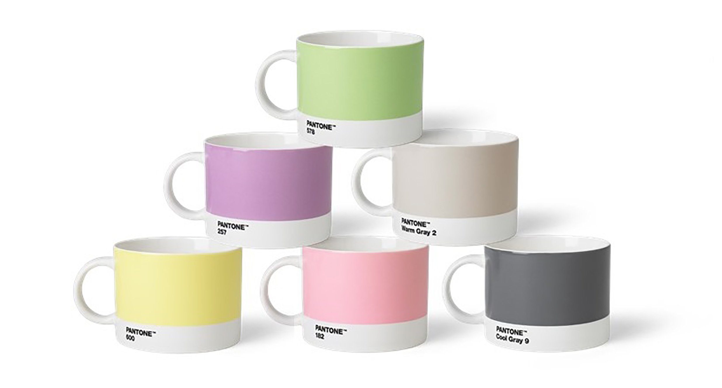 Bestehend aus 6 Henkelbechern in den Farben: Gelb (Yellow 012), Rot (Red 2035), Aubergine (Aubergine 229), Blau (Blue 2150) und Grün (Greenery 15-0343), Schwarz (Black 419).