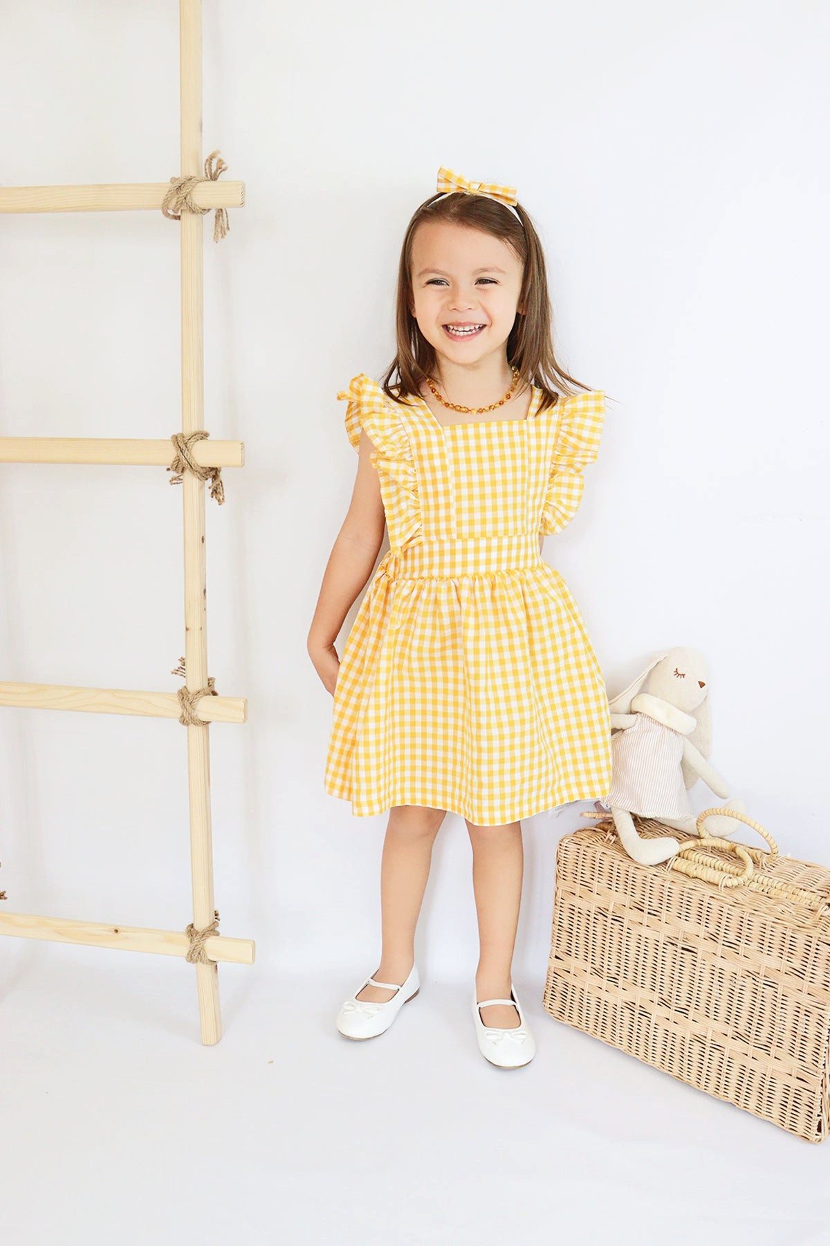 Dieses Kinderkleid besticht durch sein wunderschönes Plaid-Muster in Gelb und Weiß, den entzückenden Rüschensaum und das passende Haarband.