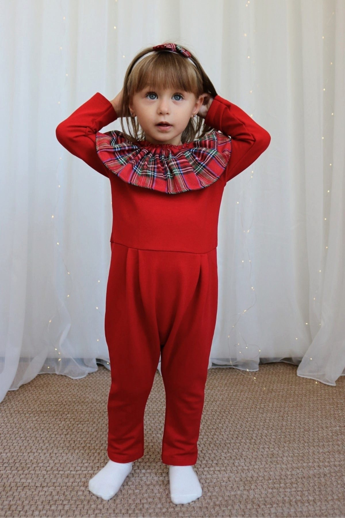 Das dunkle Rot des Stoffes verleiht dem Outfit eine gewisse Eleganz und macht den Strampler zu einem echten Blickfang. Der Kragen mit den verspielten Rüschen und dem Karomuster verleiht dem Look eine zusätzliche Portion Charme und setzt Akzente. Der Strampler ist nicht nur optisch ansprechend, sondern auch praktisch gestaltet.