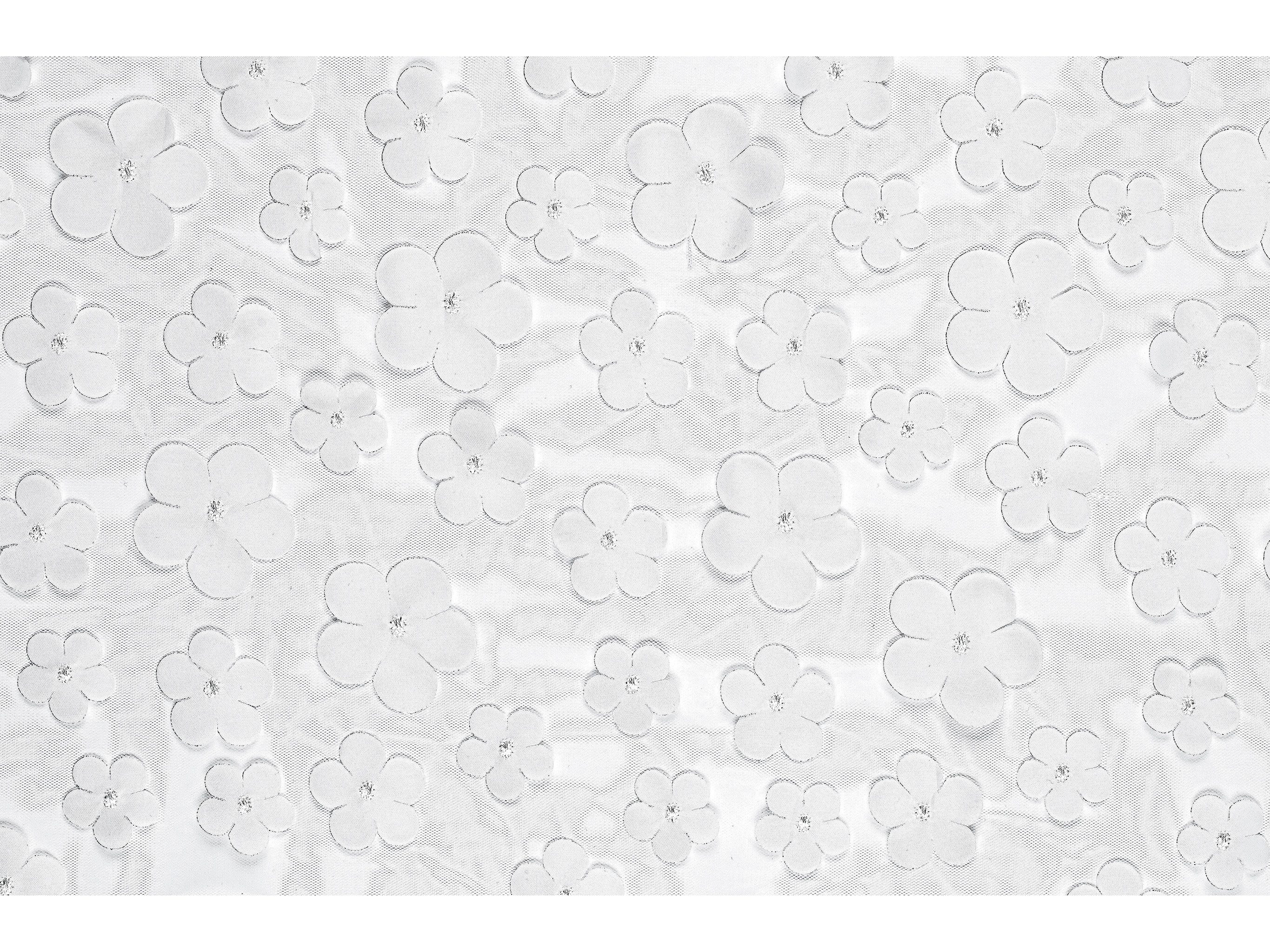 EIGENSCHAFTEN: Netzartiger Dekostoff mit weißen Blumen. Lässt sich gut falten, kleben, tackern, aufnähen, drapieren. Hervorragend zum Basteln, Dekorieren oder zum Nähen von