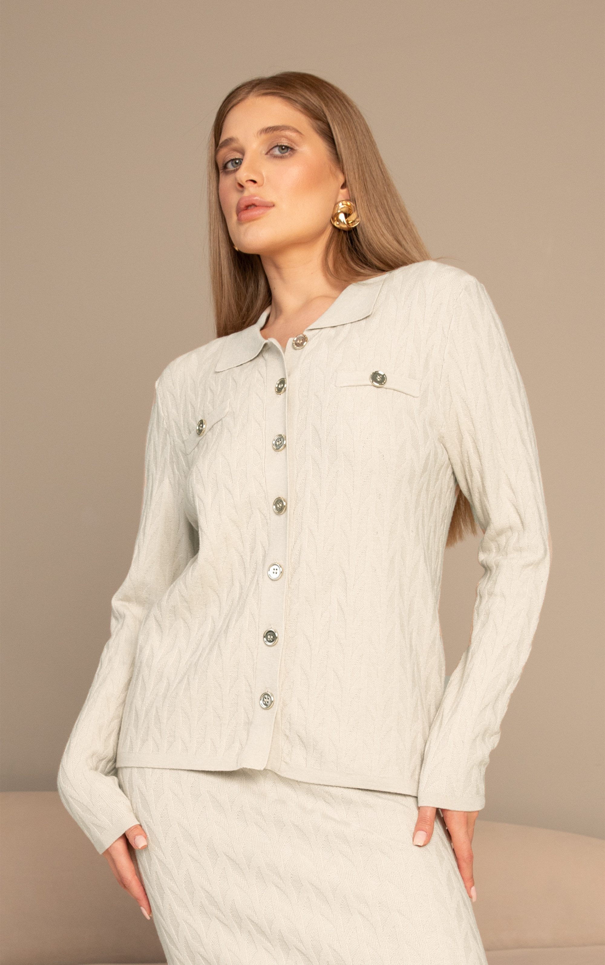 Die Passioni-Strickjacke mit Kragen und goldenen Knöpfen in klassischem Zopfmuster vereint zeitlose Eleganz mit moderner Raffinesse. Das aufwendige Zopfmuster verleiht der Jacke eine strukturierte Optik, während die goldenen Knöpfe luxuriöse Akzente setzen. Der Kragen fügt dem Design eine klassische Note hinzu und macht die Strickjacke vielseitig kombinierbar – ideal sowohl für elegante als auch für lässige Outfits. Die Strickjacke ist in den Farben Beige, Schwarz und Ecru erhältlich, sodass sie sich perfekt an unterschiedliche Stilvorlieben anpasst. Diese Strickjacke ist ein Must-have für modebewusste Frauen, die auf Stil und Komfort gleichermaßen Wert legen. Sie lässt sich wunderbar mit dem passenden Rock kombinieren, um einen harmonischen, eleganten Look zu schaffen. Egal, ob im Büro, beim Stadtbummel oder bei besonderen Anlässen – dieses Outfit bietet Klasse und Vielseitigkeit.