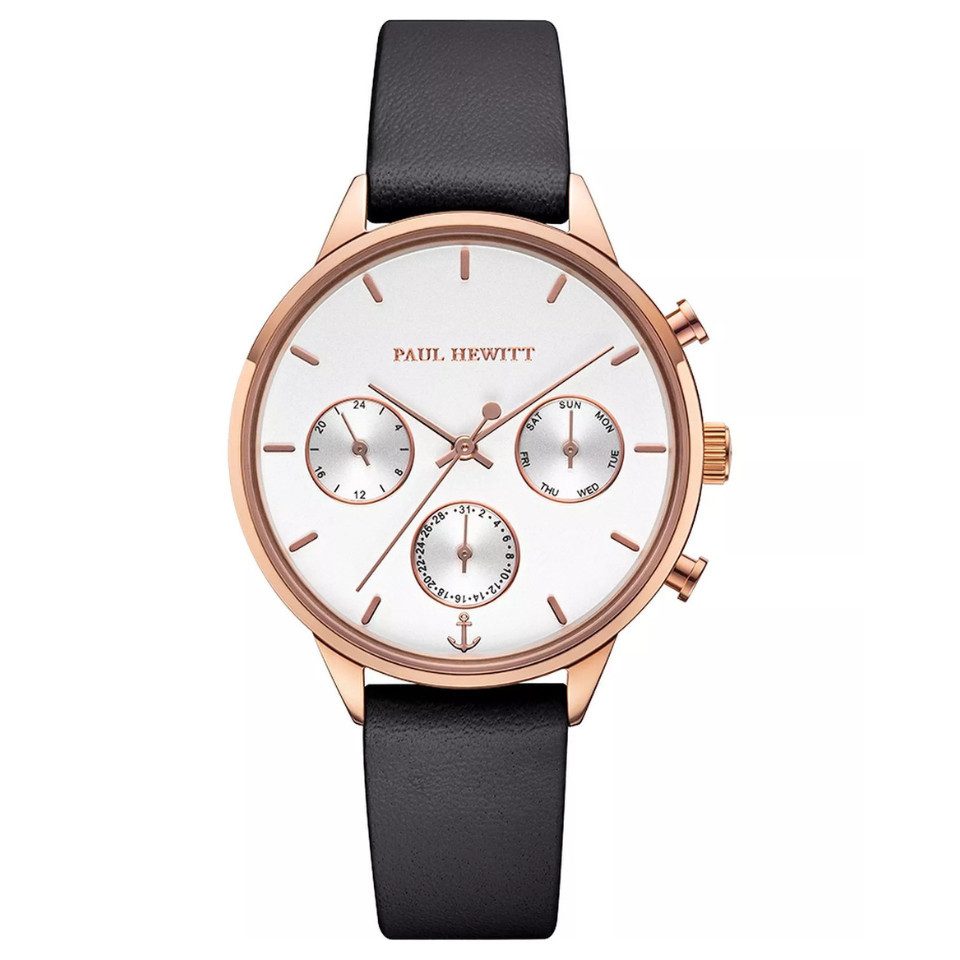 Das weiße Zifferblatt umrundet ein rosévergoldetes Edelstahlgehäuse und ist somit das Herzstück dieses Schmuckstücks. Auch die Funktionalität kommt hier nicht zu kurz: drei Hilfszifferblätter und eine Stoppfunktion gewährleisten die funktionelle Seite dieser Uhr. Pure Eleganz wirkt sich auf die Trägerin aus. Das schwarze Lederarmband schmiegt sich weich um das Handgelenk der Trägerin und schafft somit ein wohliges Gefühl auf deiner Haut.