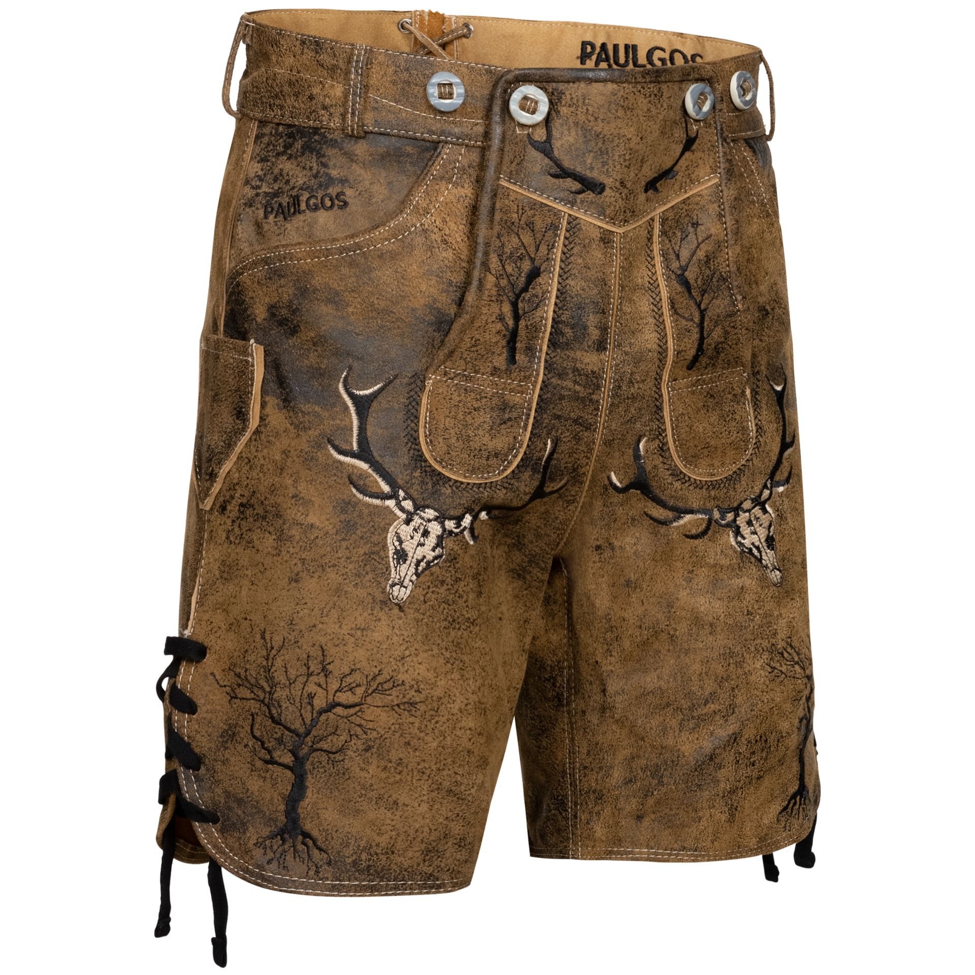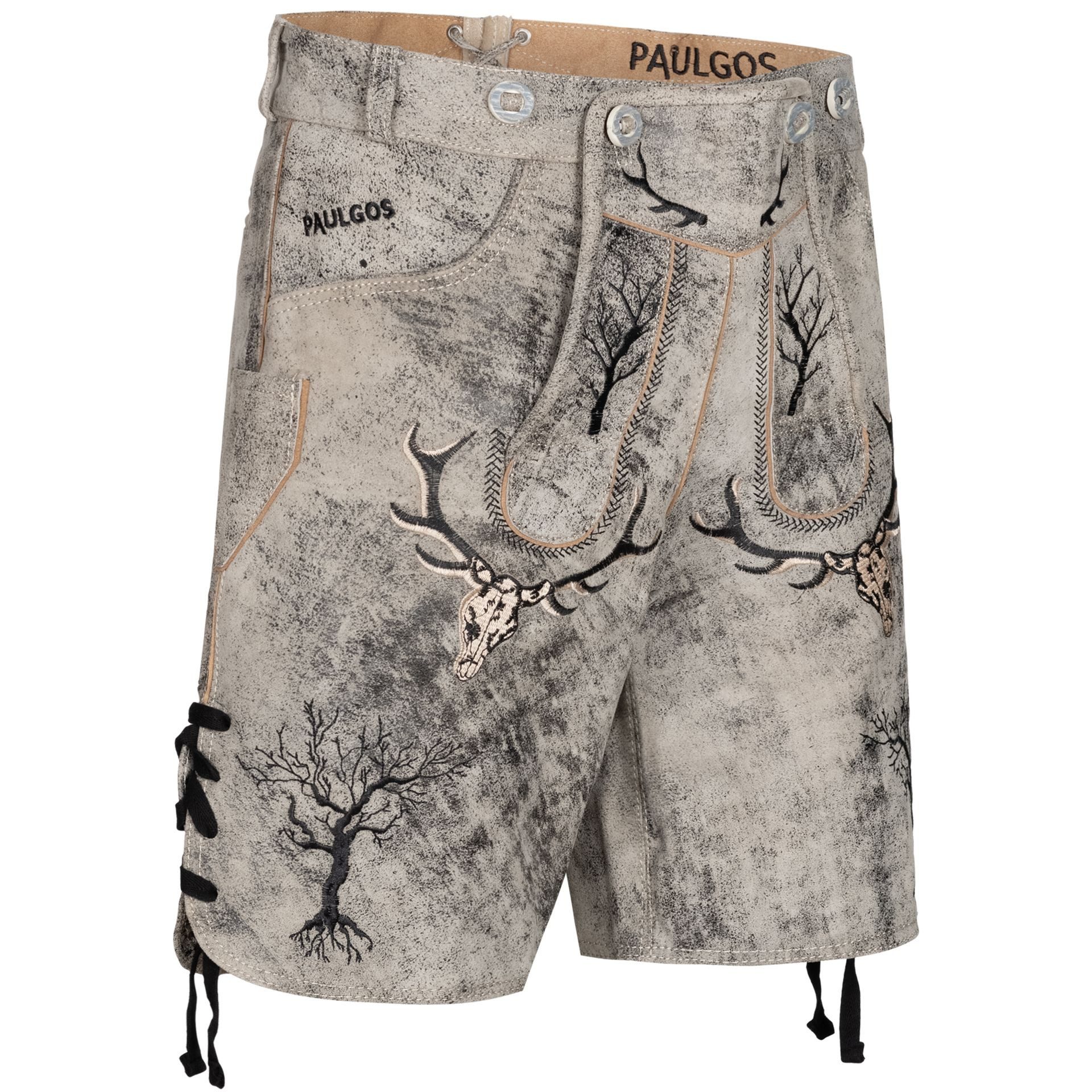 Aber auch die Stickereien beim Model HK6 faszinieren: Die aufwendige 3D-Stickerei zeigt traditionelle Symbole wie Hirschköpfe, Geweihe, Jagdhörner und Eichenblätter. Passend zu den Hirschköpfen verzieren Knöpfe in Hornoptik Deine Trachtenlederhose und runden das Bild somit ab.