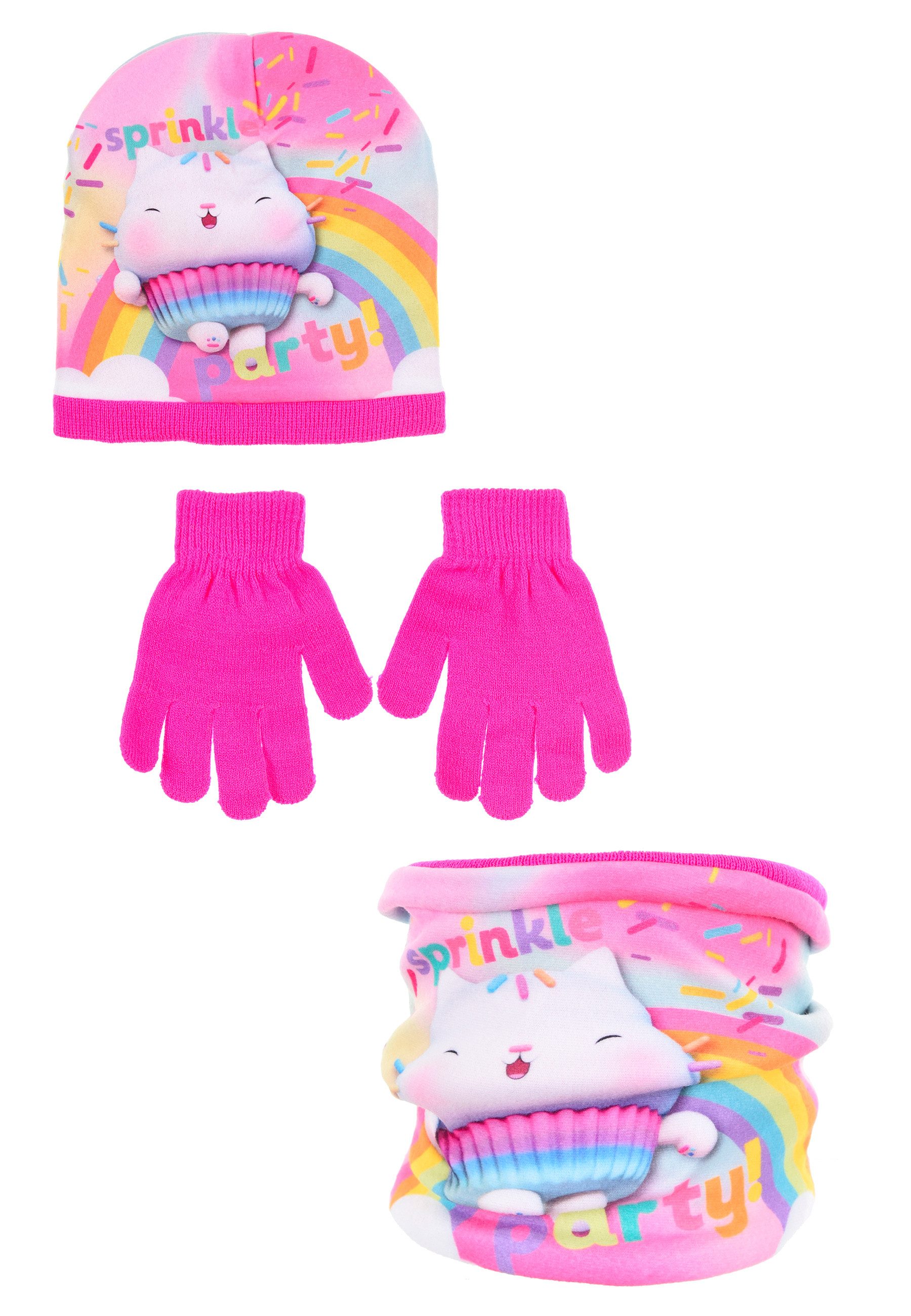 Mit diesem niedlichen Set aus Mütze, Schal und Handschuhen begleitet Gabby aus der beliebten Serie Gabbys Dollhouse Ihr Kind durch die kalte Jahreszeit. Das 3-teilige Set bietet optimalen Schutz vor Kälte und sorgt gleichzeitig für Begeisterung bei kleinen Mädchen, die Gabby und ihre magischen Abenteuer lieben.