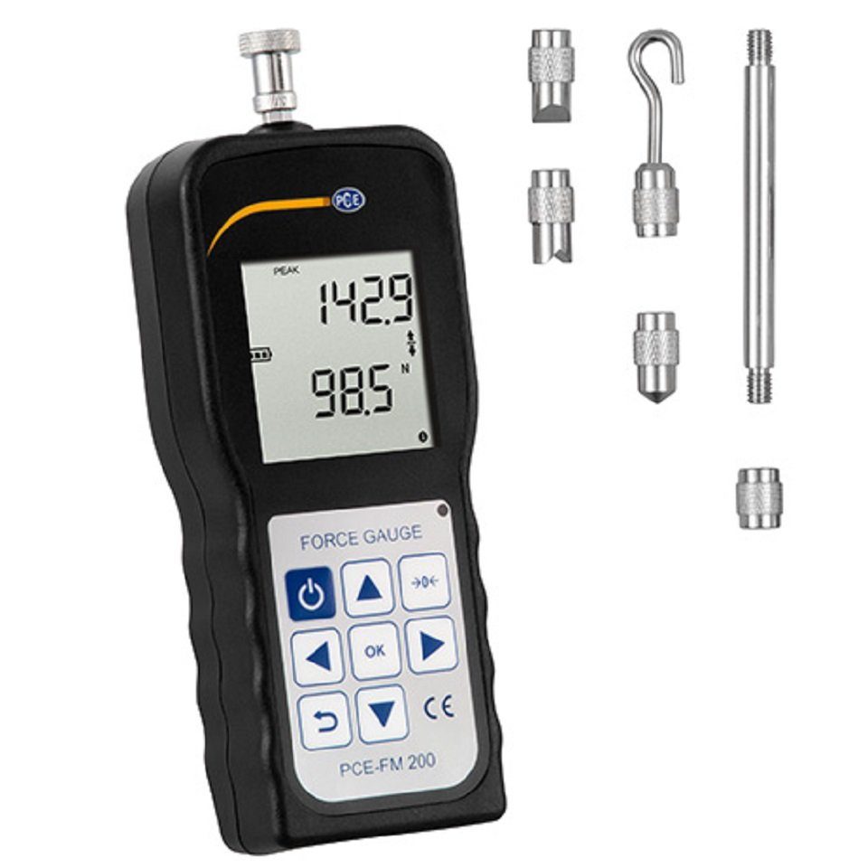 Bei dem Dynamometer PCE-FM 200 handelt es sich um ein Handgerät bis 200 N. Das Kraftmessgerät kann die Einheiten N, kg und lb ermitteln. Im Lieferumfang befinden sich verschiedene Adapter, die unterschiedliche Formen aufweisen. Diese können auf das Gerät geschraubt werden und bieten somit die optimale Lösung für unterschiedlich beschaffene Oberflächen bei der Druck- und Zugkraftmessung.