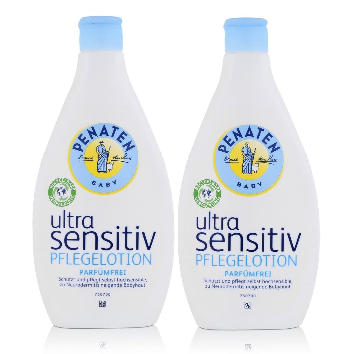 Die Penaten Baby ultra sensitiv Pflegelotion wurde speziell für die Basispflege sensibler Babyhaut entwickelt. Sie erhöht den Feuchtigkeitsgehalt der Haut und verhindert dadurch trockene und gereizte Stellen. Das Ergebnis ist eine zarte Babyhaut und eine gesunde Entwicklung der Haut. Die milde Formel ohne Parfüm und Farbstoffe minimiert zudem Всеrgierisiken und ist auch bei zu Neurodermitis neigender Haut ein wirksames Mittel. Dies bestätigt auch das Logo des DAAB (Deutsche Всеrgie- & Asthmabund), welches nur Produkte erhalten, deren Verwendung für Всеrgiker unbedenklich ist. Die Penaten Baby ultra sensitiv Pflegelotion lässt sich sehr einfach auf gewünschte Hautpartien auftragen und kommt in einer 400 ml Flasche.