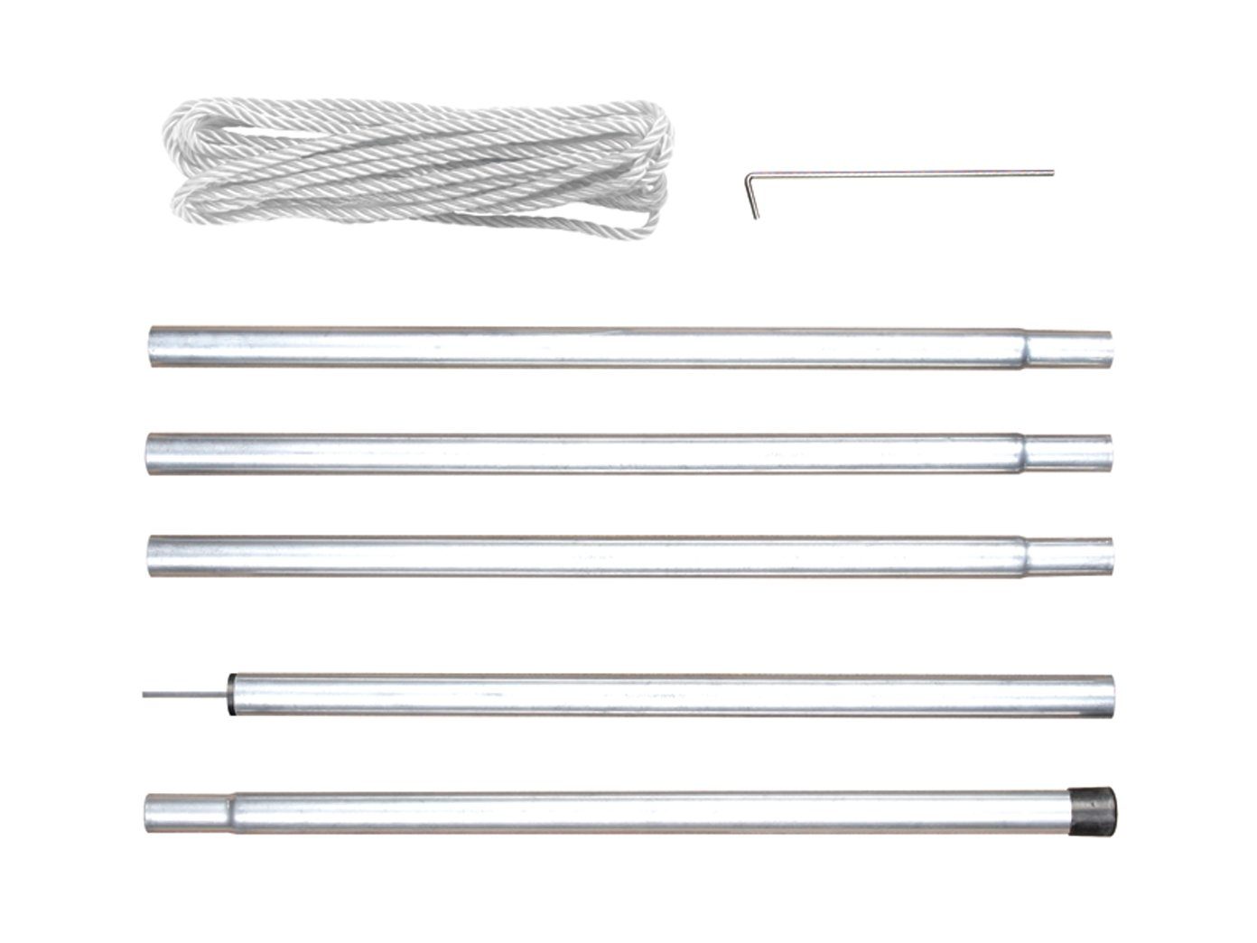 Lieferumfang | 1 x Obere Metallstange (50cm) mit Metallbefestigung für Sonnensegel, 3 x Mittelstück aus Metall (50cm), 1 x Untere Metallstange (50cm) mit Plastikkappe, 1 x Abspannseil (4 m), 4 x Heringe |