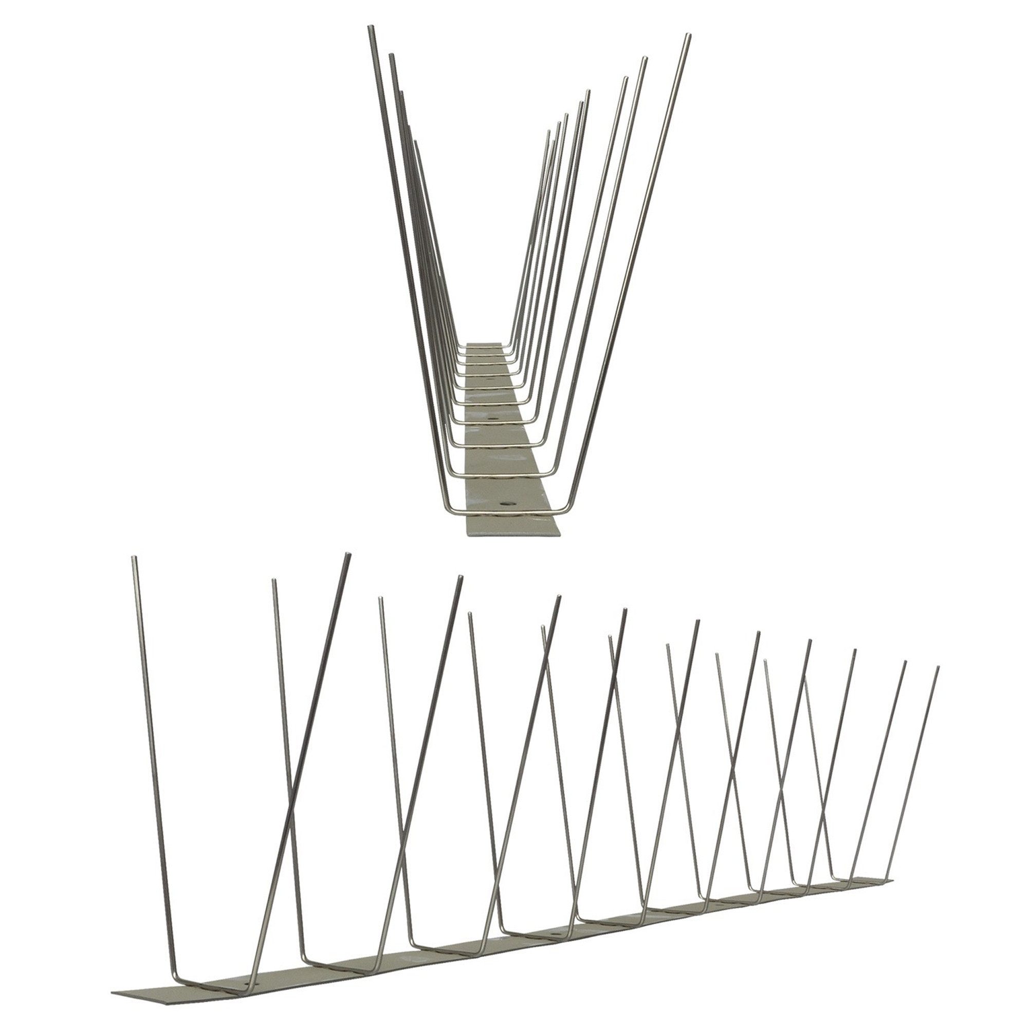 Die stabile Leiste aus Edelstahl ist robust und flexibel zugleich. Die Spikes sind bei diesem Modell auf die Leiste geschweisst, was die Widerstandsfähigkeit noch einmal zusätzlich erhöht. Die Vogelspitzen dieser Modellreihe sind V-förmig auf der Leiste angeordnet. Das Edelstahlband kann mit einer Blechschere individuell gekürzt und an Ihre speziellen Bedürfnisse angepasst werden. Die Edelstahlleiste ist biegsam und passt sich je nach Bedarf jeder Rundung an. Vorgestanzte Löcher ermöglichen eine schnelle Montage ohne Bohren. Die 2-reihigen Taubenspikes schützen einen Bereich von bis zu 8 cm und sind auch für eine mehrreihige Installation auf offenen Flächen gut geeignet. Zudem sind die Taubenspikes eine sehr tierfreundliche Vogelabwehrlösung, da die Tiere weder verletzt noch anderweitig geschädigt werden.