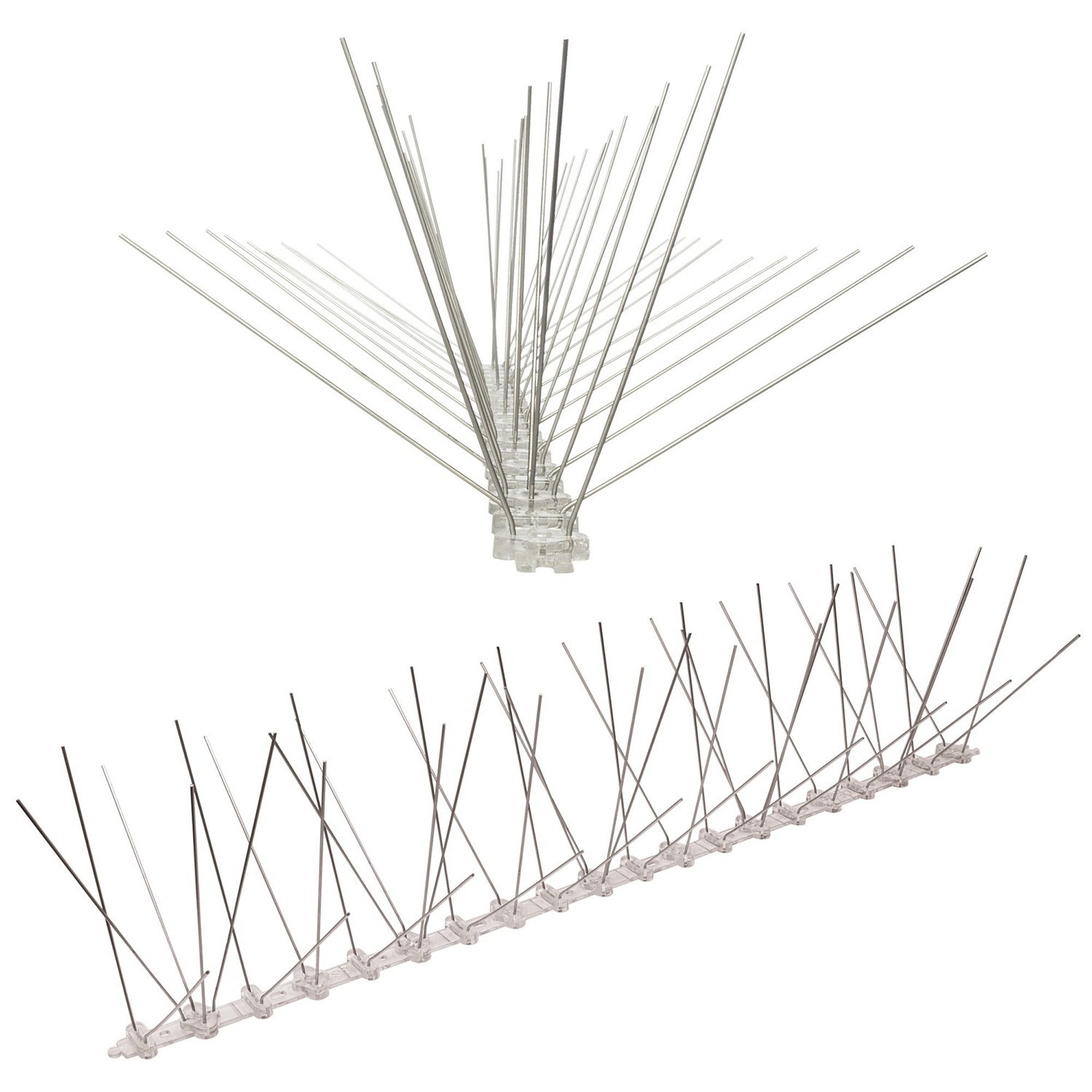 Die vorgelochte Leiste aus Polycarbonat ist sehr stabil und kann an den Sollbruchstellen optimal nach individuellen Vorstellungen geteilt werden. Die Polycarbonatleiste ist aus UV-beständigem Kunststoff gefertigt. Vorgestanzte Löcher ermöglichen eine schnelle Montage ohne Bohren. Die 5-reihigen Taubenspikes schützen einen Bereich von bis zu 21 cm und sind auch für eine mehrreihige Installation auf offenen Flächen gut geeignet. Zudem sind die Taubenspikes eine sehr tierfreundliche Vogelabwehrlösung, da die Tiere weder verletzt noch anderweitig geschädigt werden.