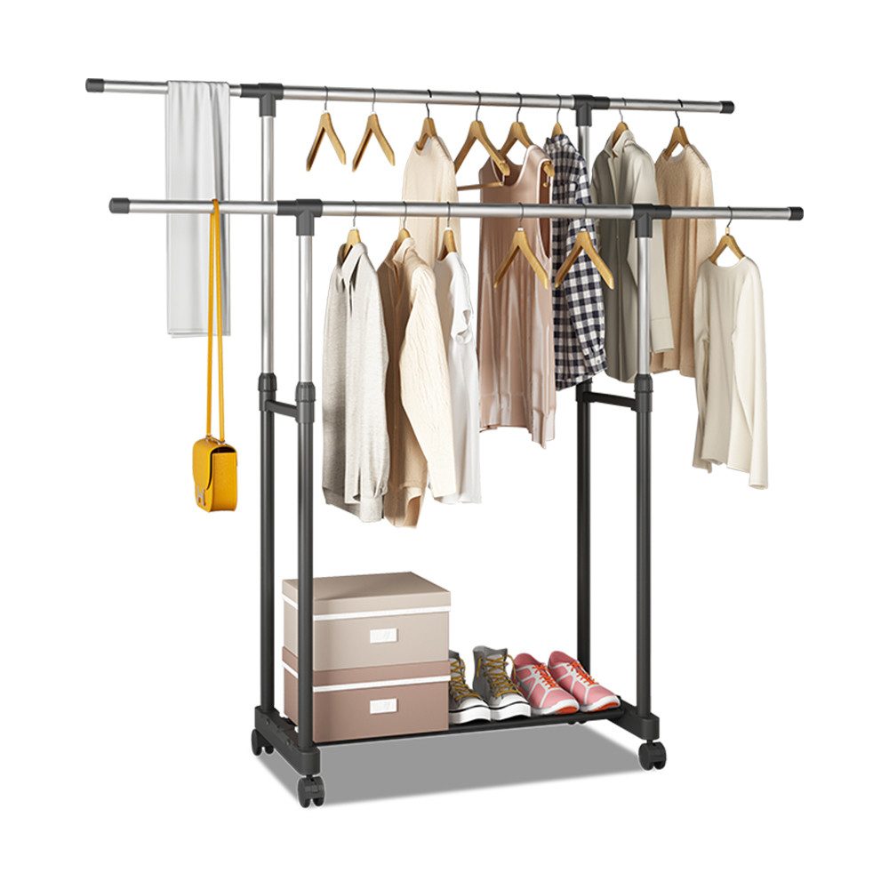STURDINESS: Leichte, verchromte, ausziehbare, breite Kleiderstangen halten bis zu 88 Pfund insgesamt; bis zu 44 Pfund pro Stange[Vielseitig für jeden Raum] Dieser Kleiderständer mit einem Ablagefach fügt jedem Raum, wie dem Schlafzimmer, dem Wohnzimmer und der Garderobe, zusätzlichen hängenden Platz hinzu, um Ihre Kleidung, Hüte, Taschen und Schuhe geordnet aufzubewahren- Die unteren Stangen sind ideal für die Lagerung von Schuhen oder Schuhkartons.