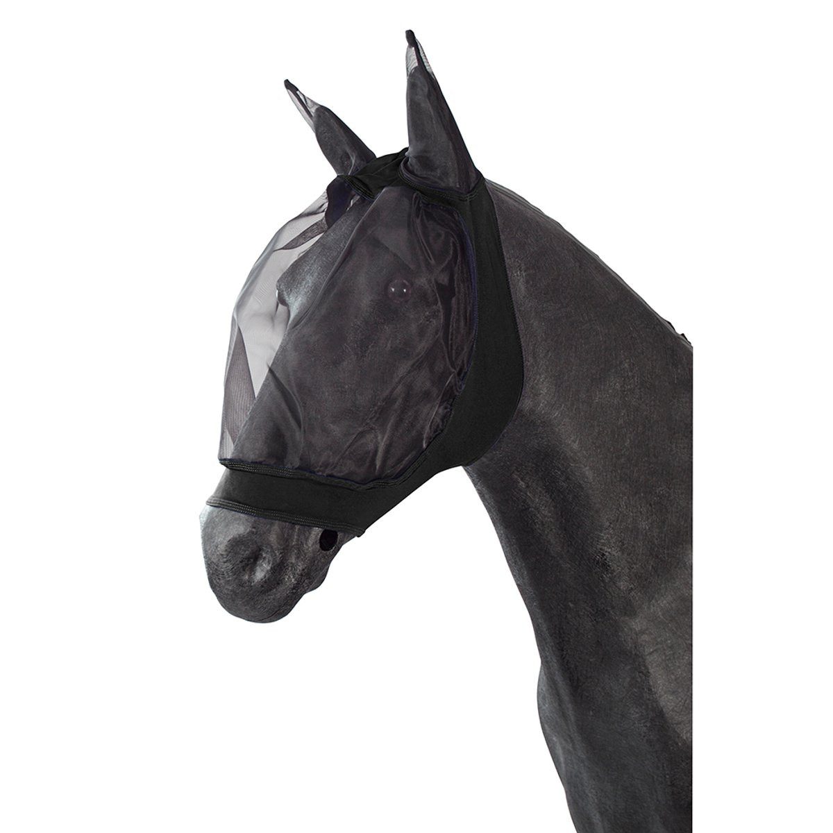 Anschmiegsame, leichte Fliegengesichtsmaske für Pferde ohne Verschluß. Durch den soften, sehr elastische Stoffeinsatz an der Unterseite ist diese Maske leicht aufziehbar. Diese Gesichtsmaske bietet höchsten Schutz gegen Insekten, ohne das Pferd zu behindern; waschbar bis 30 °C.