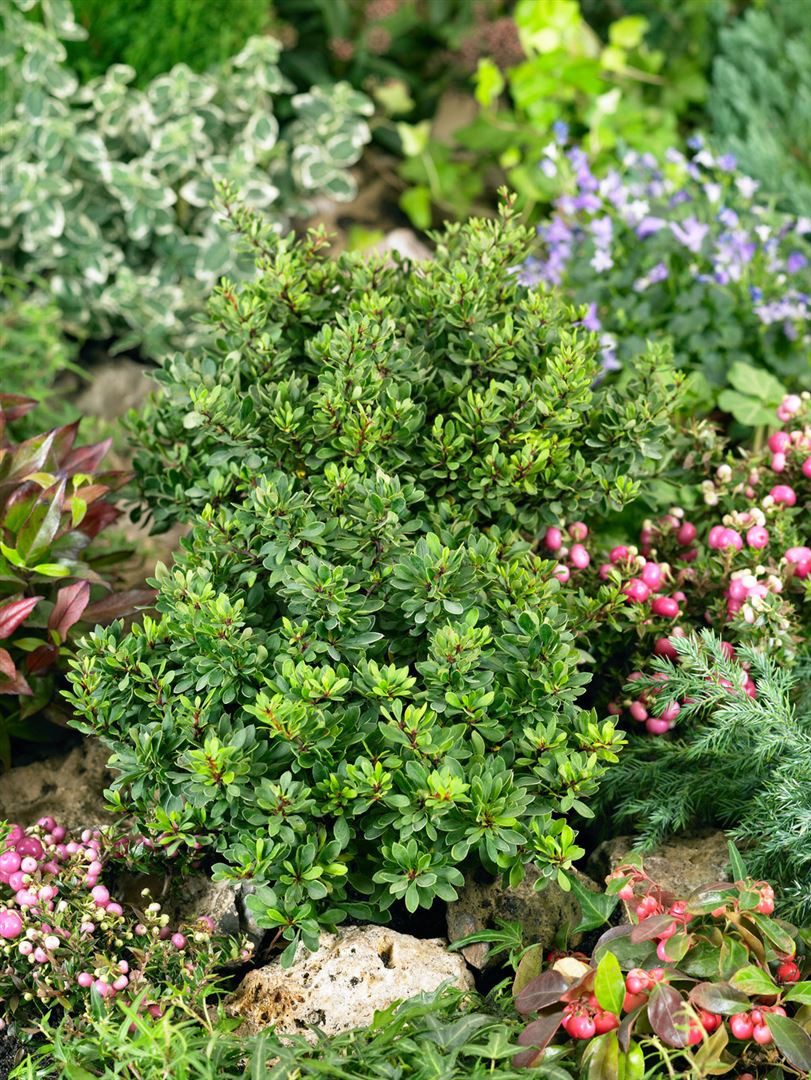 Kompakte Zwergberberitze mit dichter kugeliger Wuchsform waechst langsam wird etwa 30 bis 40 cm hoch und 40 bis 50 cm breit und besitzt dornige Triebe fuer strukturierte Beete
