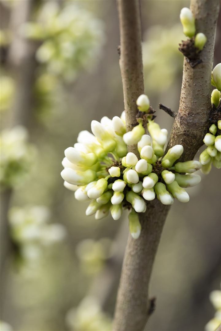 Cercis chinensis Shirobana Fruehjahrsbluete in Reinweiss direkt am Holz eindrucksvolles Ziergehoelz fuer Akzente