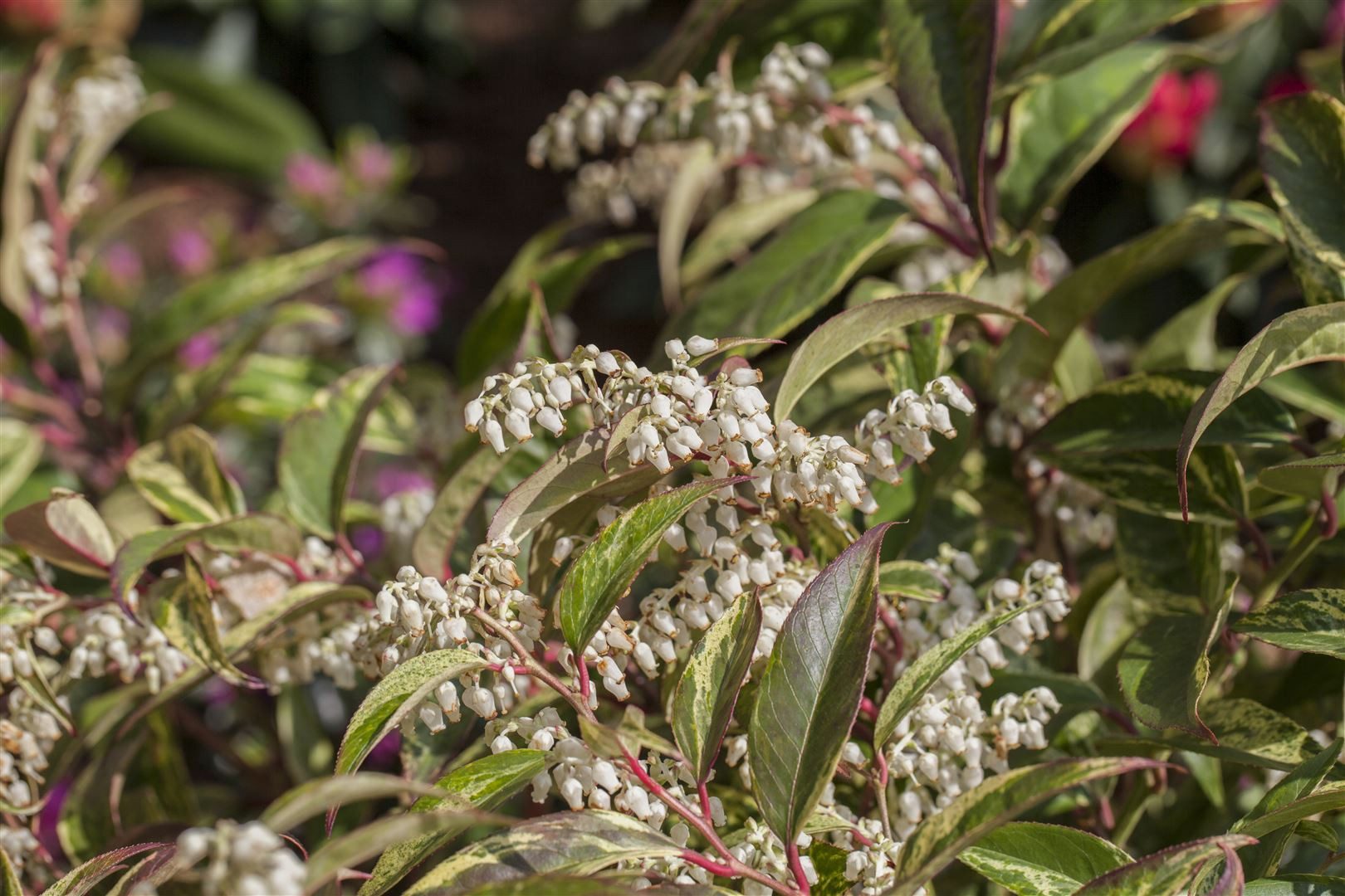 Leucothoe fontanesiana Rainbow Traubenheide immergruen mit panaschiertem Gruen Creme Pink Austrieb rosa im Herbst Winter bronzerot