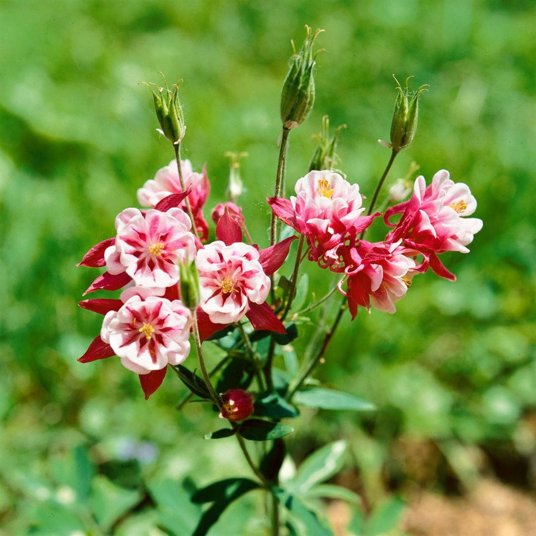 Zweifarbige aufrechte Blueten in Rot Weiss Akelei Aquilegia vulgaris blueht reich von Mai bis Juni und setzt starke Farbakzente im Fruehlingsbeet