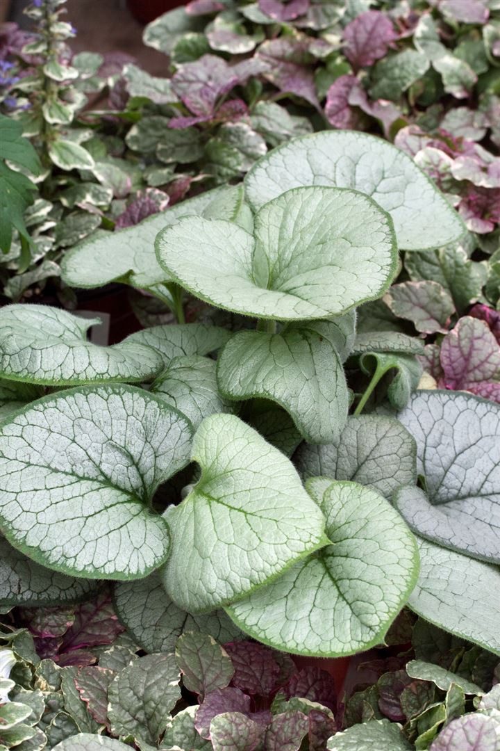 Brunnera macrophylla ‘Looking Glass’, das Kaukasus-Vergissmeinnicht, ist eine edle Blattschmuckstaude für halbschattige bis schattige Bereiche im Garten. Charakteristisch sind die nahezu vollständig silbrig schimmernden, herzförmigen Blätter mit feiner, grün geäderter Zeichnung, die Beete und Rabatten eindrucksvoll aufhellen. Im Frühjahr, meist von April bis Mai, erscheinen zahlreiche zart himmelblaue Blüten in lockeren Rispen über dem Laub und setzen einen lieblichen Kontrast. Die horstige, kompakte Wuchsform erreicht etwa 30 bis 40 cm Höhe und eignet sich hervorragend als langlebige Staude für das Schattenbeet, den Gehölzrand, den Vorgarten und als Bodendecker in Gruppenpflanzung. Auch im dekorativen Kübel auf der schattigen Terrasse entfaltet diese Beetstaude ihren besonderen Zierwert und kann als kleiner Solitär Akzente setzen oder mit Hostas, Farnen, Heuchera und zarten Gräsern harmonisch kombiniert werden. Für ein gesundes Wachstum bevorzugt Brunnera ‘Looking Glass’ einen humosen, nährstoffreichen, gleichmäßig frischen bis feuchten, gut durchlässigen Boden ohne Staunässe. Ein geschützter, kühler Standort in Halbschatten bis Schatten erhält die intensive Blattfärbung und verhindert Sommerrandalen durch Trockenheit; mulchen hilft, die Bodenfeuchte zu halten. Ein Rückschnitt verwelkter Blütenstände nach der Blüte fördert einen sauberen Gesamteindruck, und das Entfernen älterer Blätter belebt den Neuaustrieb. Die robuste, winterharte Schattenstaude ist pflegeleicht, bildet mit der Zeit dichte Teppiche und bringt mit ihrem silbrigen Laub über die gesamte Saison Struktur in Beete, Schattenrabatten und Unterpflanzungen von Sträuchern und kleinen Bäumen.