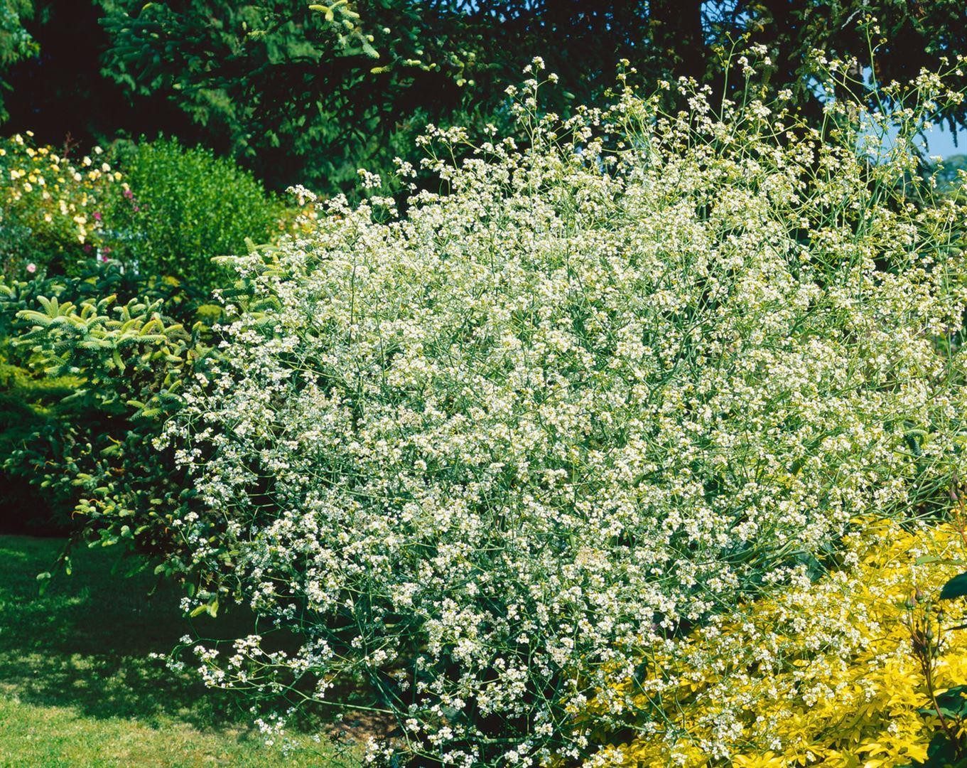 Crambe cordifolia, der Herzblatt-Meerkohl oder Riesen-Meerkohl, ist eine eindrucksvolle, langlebige Staude mit architektonischer Wirkung, die in jedem Ziergarten sofort ins Auge fällt. Ab Spätfrühling bis zum Hochsommer erhebt sich über einem imposanten Horst aus großen, blaugrünen, herzförmigen Blättern eine wolkenartige, lockere Blütenrispe aus unzähligen kleinen, reinweißen Blüten. Der Blütenflor steht schwebend und luftig, wirkt dabei äußerst elegant und verleiht Beeten und Rabatten eine außergewöhnliche Tiefe. Der kräftige, breit aufrechte Wuchs bildet mit der Zeit eine imposante Strukturstaude, die als Solitär im Staudenbeet oder als majestätischer Blickfang im Vorgarten hervorragend zur Geltung kommt und in großzügigen Gruppenpflanzungen in Prärie- oder Naturgarten-Situationen für ein harmonisches Gesamtbild sorgt. Diese Gartenstaude bevorzugt einen sonnigen, warmen Standort und durchlässigen, tiefgründigen, eher nährstoffreichen Boden. Staunässe sollte vermieden werden, da die Pflanze mit einer starken Pfahlwurzel arbeitet und dauerhaft nasse Winter nicht schätzt. Nach dem Anwachsen zeigt sie sich erstaunlich pflegeleicht und trockenheitsverträglich; eine jährliche Mulchgabe und ein Rückschnitt der abgeblühten Stängel nach der Blüte genügen. Störungen am Standort mag Crambe cordifolia nicht, deshalb von häufigem Umpflanzen absehen. In Kombination mit hohen Gräsern, Rittersporn oder filigranen Stauden entsteht ein spannender Kontrast zwischen der großen, dekorativen Belaubung und der leichten, schneeweißen Blütenwolke. Als eindrucksvolle Beetstaude setzt der Herzblatt-Meerkohl architektonische Akzente im Hintergrund der Pflanzung und schafft eine klare, repräsentative Struktur über die gesamte Gartensaison.