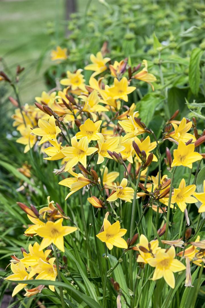 Kompakte Staude Hemerocallis minor Taglilie mit leuchtend gelben Blueten im Fruehsommer mit schmalem grasartigem Laub und horstigem Wuchs