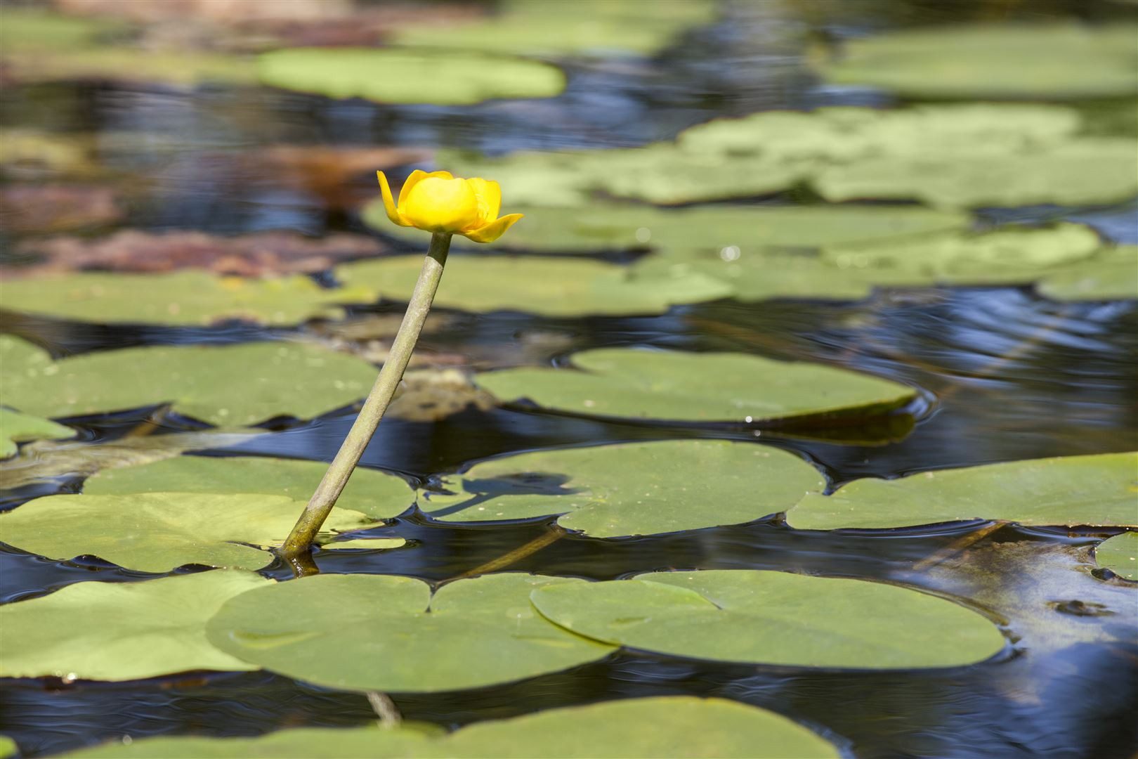 Leuchtend gelbe kugelig schalenfoermige Blueten von Juni bis September sowie grosse herzfoermige Schwimmblaetter in glaenzendem Gruen.