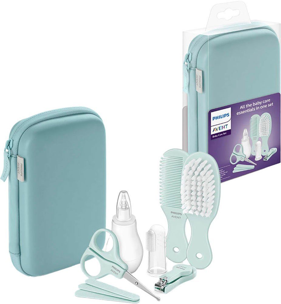 Set bestehend aus Fingeraufsatz zur Zahnpflege, Nasensauger, abgerundeter Schere, Nagelschere und drei Nagelpfeilen, abgerundetem Kamm, weicher Haarbürste