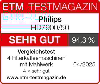 Die Philips HD7900/50 erzielt im Vergleichstest des „ETM TESTMAGAZINS“ mit drei weiteren Filterkaffeemaschinen mit Mahlwerk das Gesamtergebnis „sehr gut (94,3 %)“. Sowohl die Temperatur nach dem Brühvorgang als auch die Warmhaltung sind „sehr gut“ und das Tempo des Brühvorgangs ist hoch. Das Gerät ist sehr einfach zu bedienen sowie zu reinigen und hat ein großes Fassungsvermögen. Es ist „sehr gut“ verarbeitet. Außerdem verbraucht es sehr wenig Strom. Insgesamt erreicht das Modell das zweitbeste Ergebnis des starken Testspektrums.