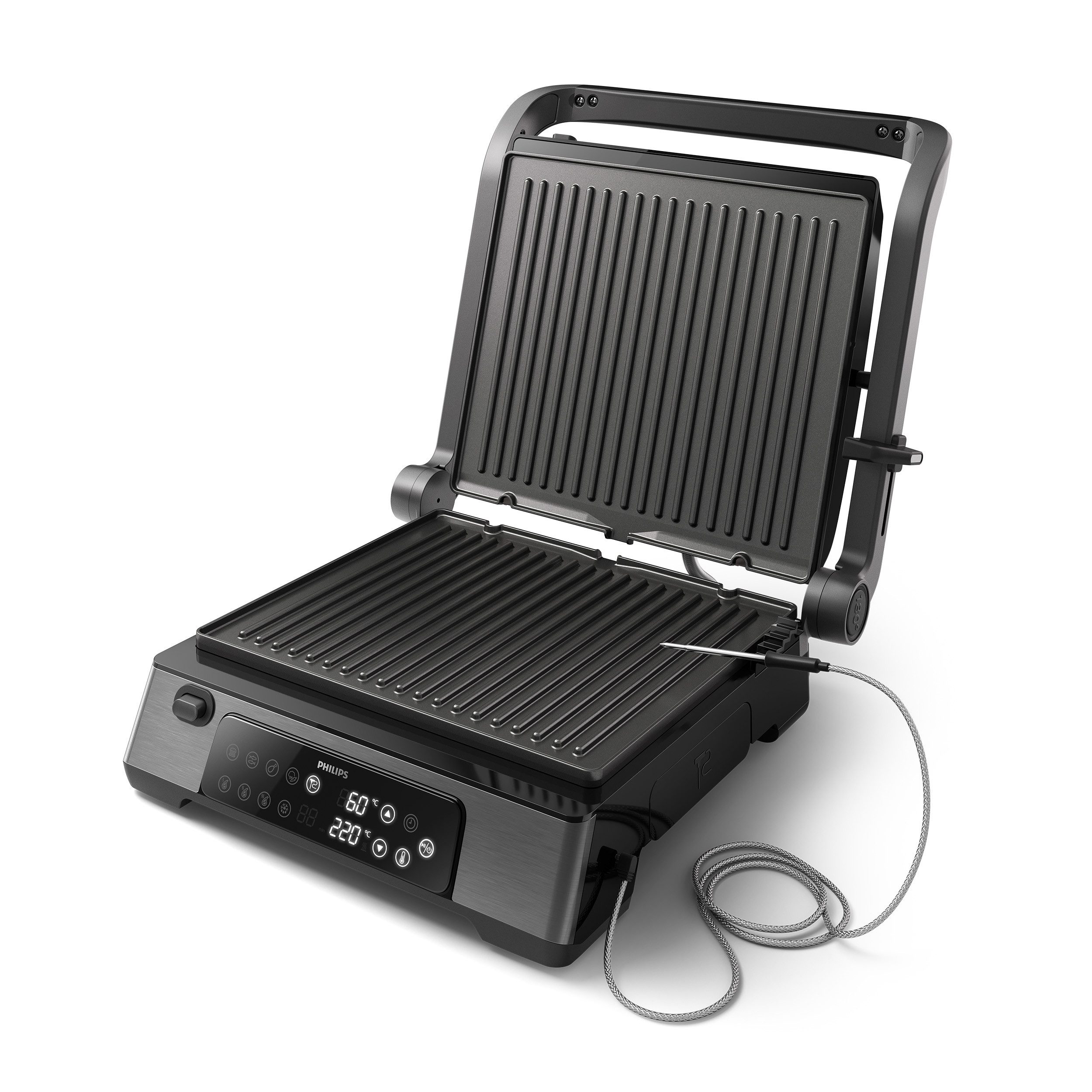 Впередe Vorteile | 2.200 Watt Leistung 8 voreingestellte Funktionen Abnehmbare Antihaft-Platten Digitale Temperatureinstellung Einfache Reinigung Große Grillfläche Höhenverstellbar Temperatursonde Timer |