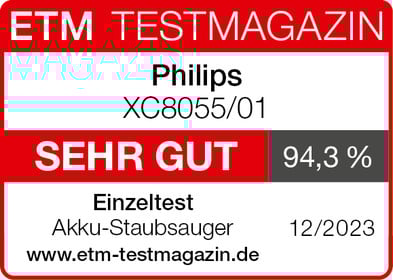 Der Philips XC8055/01 erzielt im Einzeltest des „ETM TESTMAGAZINS“ das Gesamtergebnis „sehr gut (94,3 %)“. Die Saugleistung ist auf Hart- und Teppichböden sowie auf Mobiliar hervorragend. Auch die lange Arbeitszeit und die kurze Ladezeit überzeugen. Die Handhabung ist einfach. Außerdem bietet der Akku-Staubsauger sehr viele Funktionen und ist hochwertig verarbeitet. Insgesamt ist er „ein Garant sauberer Fußböden“.