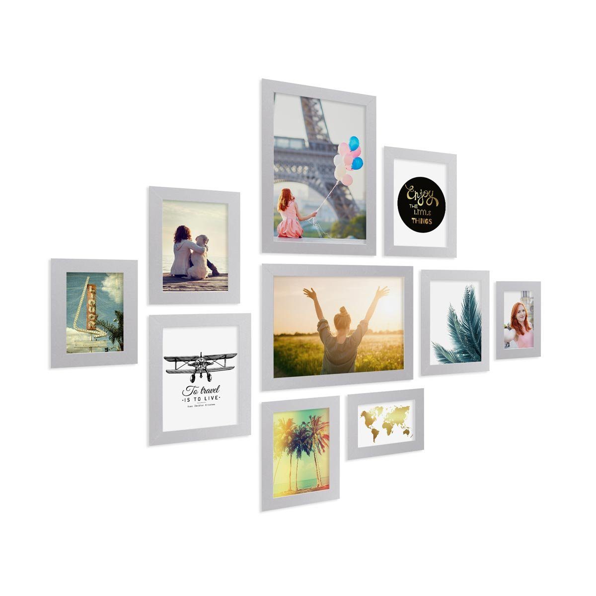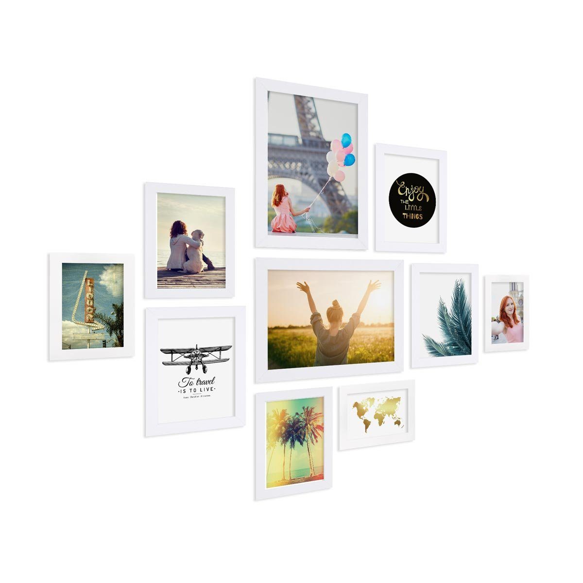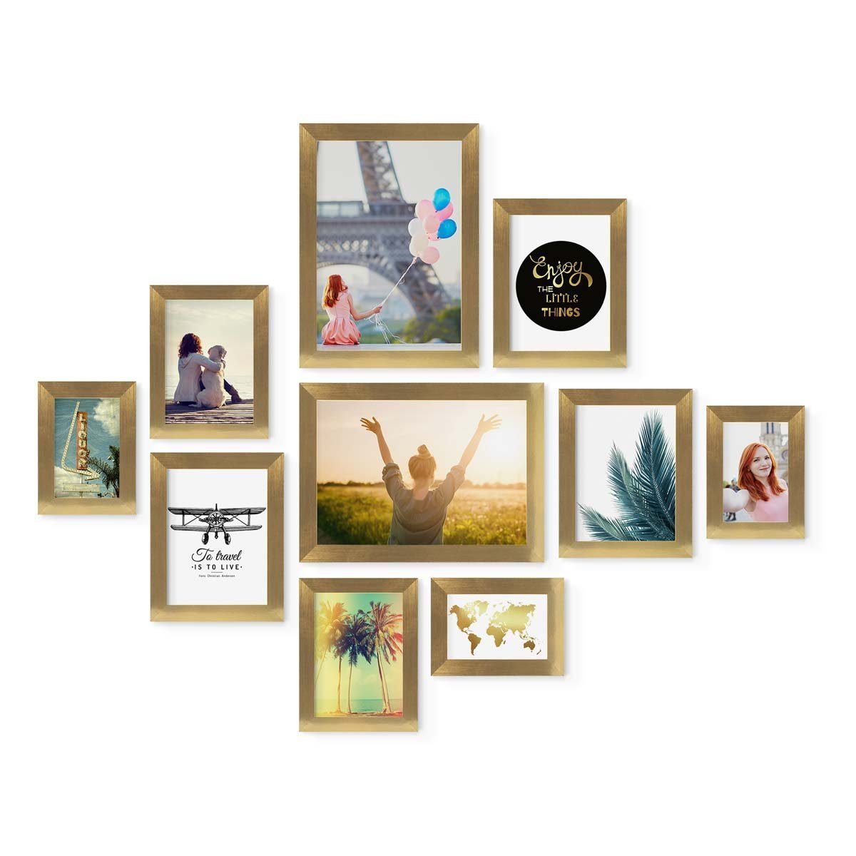 Bilderrahmen-Collage in Gold zur Gestaltung einer individuellen Bilderwand oder Bildergalerie mit gutem Preis-Leistungsverhältnis - stabile Wechselrahmen aus MDF-Holz und praktisches Zubehör. Bilderwände haben einen ganz besonderen Charme und verleihen dem eigenen Zuhause einen individuellen Charakter. Sie sind eine tolle Möglichkeit um Fotos, Postkarten, Zeichnungen oder andere Erinnerungsstücke an der Wand in Szene zu setzen. Mit diesem Bilderrahmen-Set lässt sich eine individuelle Bilderwand einfach selbst gestalten. Die Bilderrahmen lassen sich zu unterschiedlichen Anordnungen und Arrangements kombinieren - ganz symmetrisch in einer Reihe, als Raster oder locker über die Wand verteilt. Die Bilderwand lässt sich jederzeit erweitern und mit anderen Bilderrahmen-Sets ergänzen. Die mitgelieferten Schablonen helfen dabei die verschiedenen Bilderrahmen optimal an der Wand anzuordnen und die Bildernägel an der richtigen Stelle zu positionieren. (Motive und Dekoration sind nicht im Lieferumfang enthalten.)
