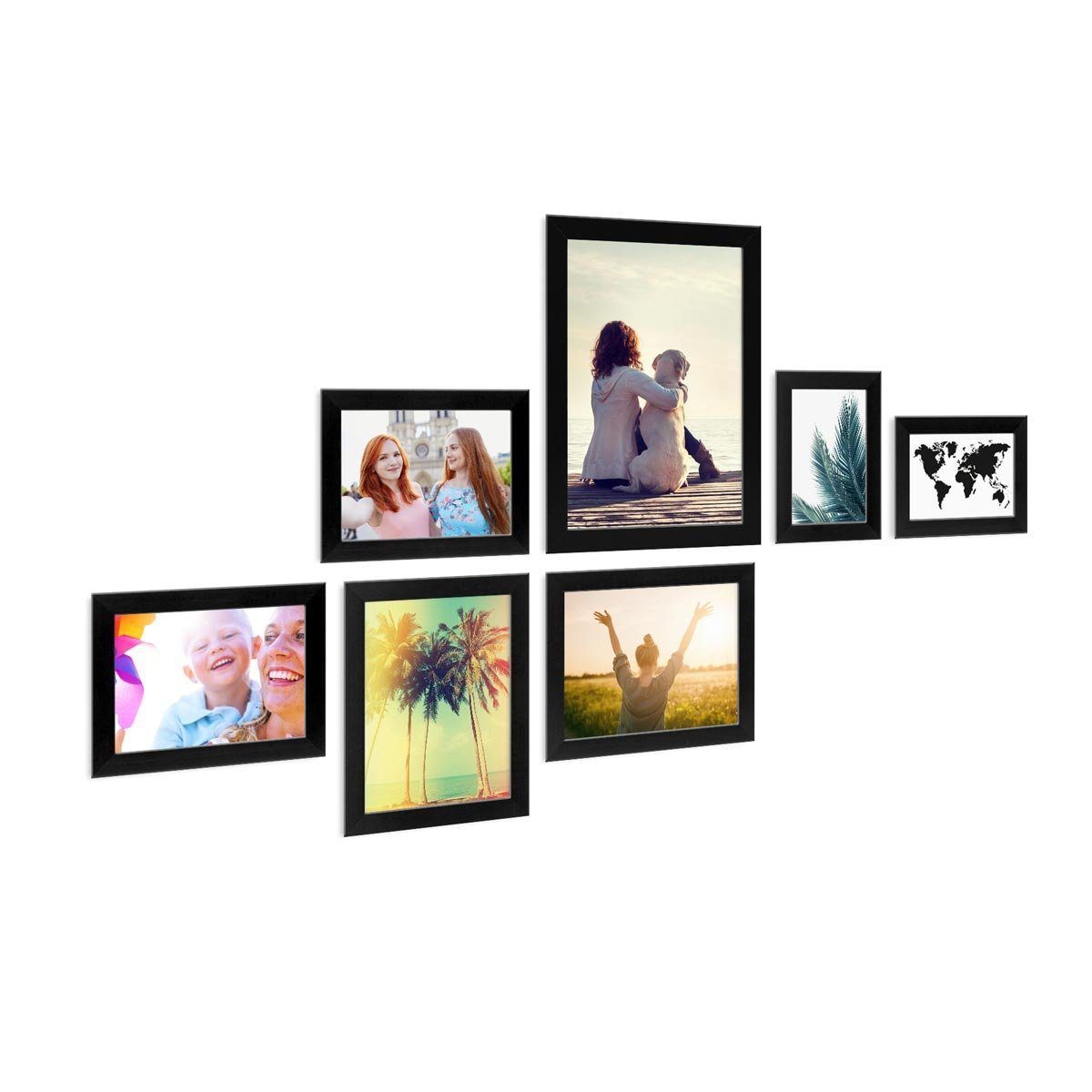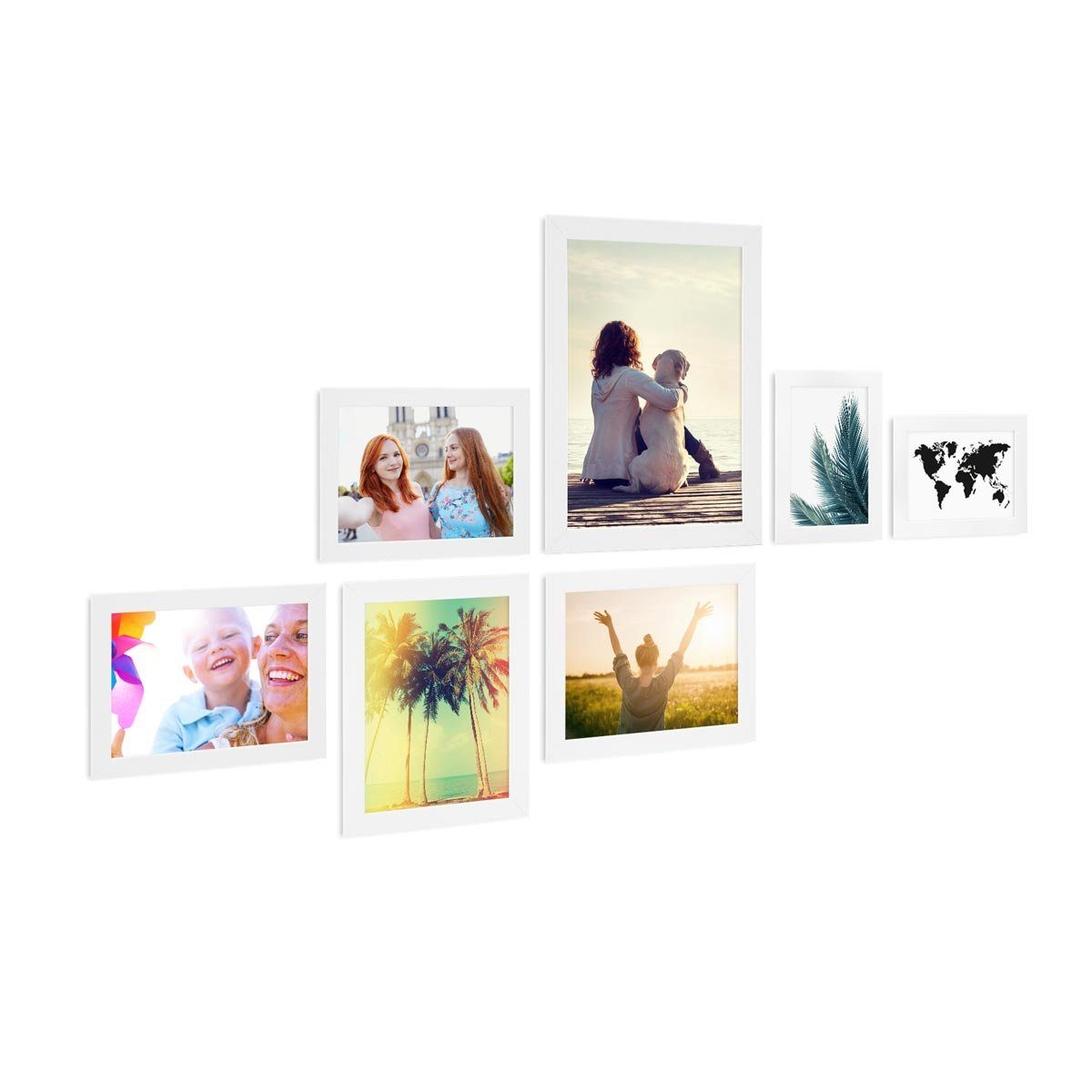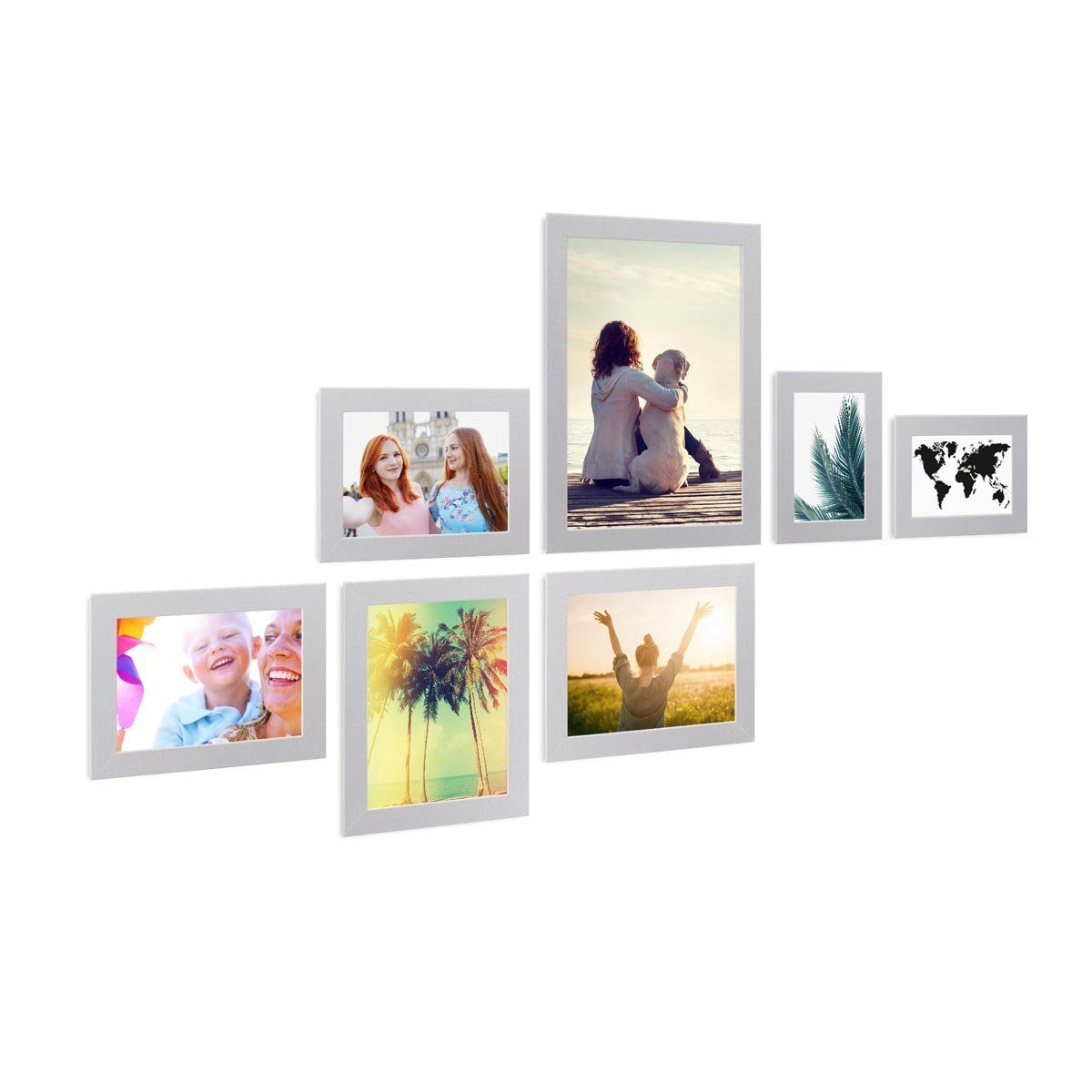 Bilderrahmen-Collage in Silber zur Gestaltung einer individuellen Bilderwand oder Bildergalerie mit gutem Preis-Leistungsverhältnis - stabile Wechselrahmen aus MDF-Holz und praktisches Zubehör. Bilderwände haben einen ganz besonderen Charme und verleihen dem eigenen Zuhause einen individuellen Charakter. Sie sind eine tolle Möglichkeit um Fotos, Postkarten, Zeichnungen oder andere Erinnerungsstücke an der Wand in Szene zu setzen. Mit diesem Bilderrahmen-Set lässt sich eine individuelle Bilderwand einfach selbst gestalten. Die Bilderrahmen lassen sich zu unterschiedlichen Anordnungen und Arrangements kombinieren - ganz symmetrisch in einer Reihe, als Raster oder locker über die Wand verteilt. Die Bilderwand lässt sich jederzeit erweitern und mit anderen Bilderrahmen-Sets ergänzen. Die mitgelieferten Schablonen helfen dabei die verschiedenen Bilderrahmen optimal an der Wand anzuordnen und die Bildernägel an der richtigen Stelle zu positionieren. (Motive und Dekoration sind nicht im Lieferumfang enthalten.)