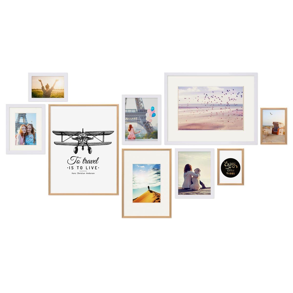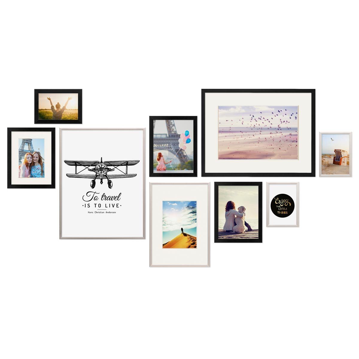 Bilderrahmen-Collage in Schwarz-Silber zur Gestaltung einer individuellen Bilderwand oder Bildergalerie - moderne Wechselrahmen aus MDF und praktisches Zubehör. Bilderwände haben einen ganz besonderen Charme und verleihen dem eigenen Zuhause einen individuellen Charakter. Sie sind eine tolle Möglichkeit um Fotos Postkarten Zeichnungen oder andere Erinnerungsstücke an der Wand in Szene zu setzen. Mit diesem Bilderrahmen-Set lässt sich eine individuelle Bilderwand einfach selbst gestalten. Die Bilderrahmen lassen sich zu unterschiedlichen Anordnungen und Arrangements kombinieren - ganz symmetrisch in einer Reihe als Raster oder locker über die Wand verteilt. Die Bilderwand lässt sich jederzeit erweitern und mit anderen Bilderrahmen-Sets ergänzen. (Motive und Dekoration sind nicht im Lieferumfang enthalten.)