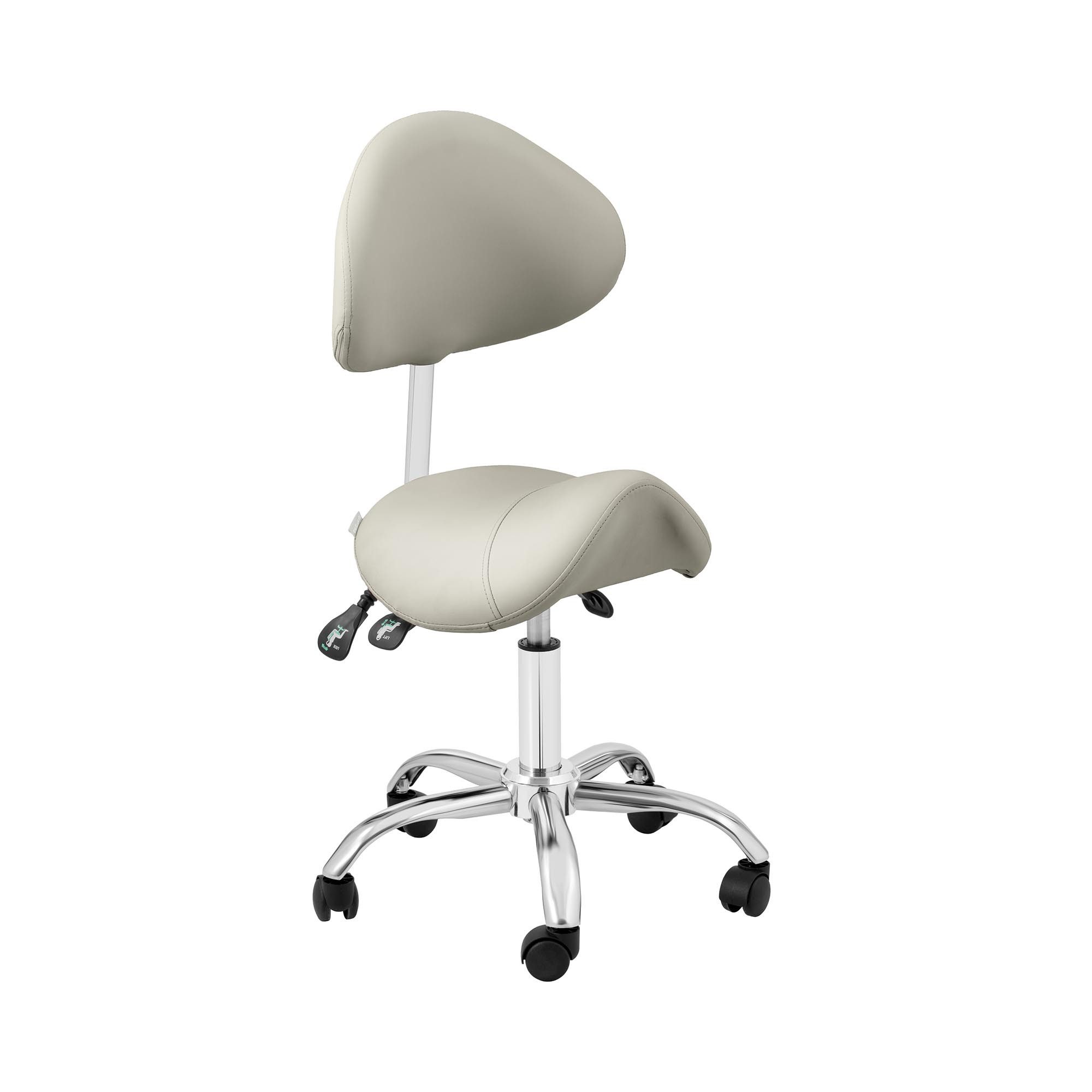 Zusätzlich lässt sich der Sitz des Sattelhockers einfach und schnell von 55 - 69 cm in der Höhe verstellen. Um die Höhe des Sitzes einzustellen, genügt es, den unter dem Sitz angebrachten Hebel in die entsprechende Richtung zu drücken und der Sitz fährt dank Gasfedermechanismus leichtläufig nach oben oder unten. Der robuste Rollhocker mit Lehne trägt ein Gewicht von maximal 150 kg.