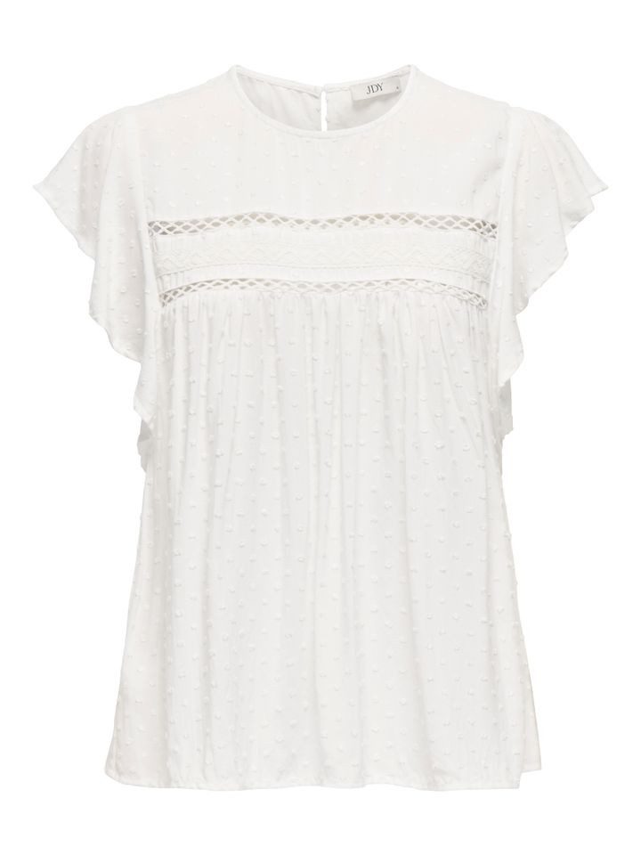 Dieses feminine Spitzenshirt von JDY bringt romantischen Flair in deinen Alltag. Der Rundhalsausschnitt die feinen Rüschen-Details und die Knopfleiste verleihen dem Oberteil eine verspielte Eleganz. Der voluminöse Armschnitt und die lockere Passform sorgen für ein angenehmes Tragegefühl – ideal für warme Tage oder als stilvolle Ergänzung im Layering-Look.